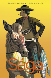 I když začátek vypadal trochu nejistě, divně, hned se dostáváme k meritu věci a skutečně poznáme, o co šlo. Prostě je jednodušší tvrdit, že má Alana dítě s Princem Robotem než s Markem, který je z nesvářené strany. I tady na westernové planetce má válka své místo, a tak se musí Marko ukrývat. Zatím kope kanál na hovna. Opravdu. I tohle je součást „Ságy, taková celkem překvapivá, ale naprosto padnoucí přízemnost, jež plyne z toho, že postavy jsou živé, nikoli nutně vyumělkované. A to přesto, že je to silně vědecko-fantastické a fantasy. Tady se prostě odehrávají i scény jako vykonávání základních potřeb. A někdy to má hodně drsné následky. Brian K. Vaughan se nebojí ani černého humoru. Velmi mu opět pomáhá Fiona Staples, jejíž kresba se hodí jednoduše pro všechno, co Brian vymyslí. Ona tomu ještě přidá něco navíc. Její mimozemšťané a monstra jsou prostě úchvatní.