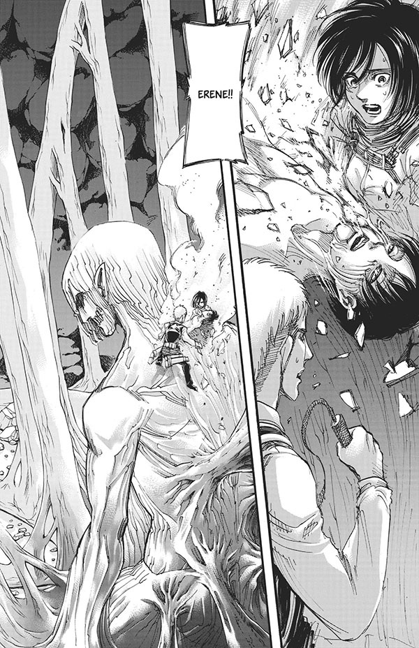 Hadžime Isajama je takový zvláštní vypravěč. Chvílemi je strašně doslovný, hodně okecává, věnuje se až technickému provedení některých zbraní s nákresem fungování, ale pak najednou udělá takový šílený skok v ději, jako kdyby se mu už nechtělo kreslit ty bitvy s titány, jako kdyby ho to už prostě nebavilo a on se raději patlal v tom, co až tak zásadní není a co není až tak strhující. V pár větách pak jen řekne, co se stalo. Jako kdyby Hadžime Isajama prostě rezignoval místy na akci a raději se věnoval dialogům, které nejsou vyloženě unavující, ale přesto by mohlo dojít k jejich zkrácení. Někde si jen honí triko nad postavami a ukazuje, jak jsou ty postavy důležité, ale nakonec se ukazuje, že ani tak nejsou, že stejně jde jen o to, aby měl funkční svět. Funkční svět, kde se toho tolik neděje a tajemství jsou odhalována velmi pomalu.