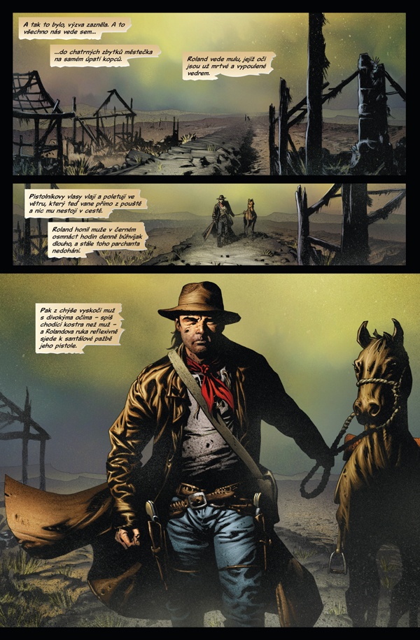 Už rozjímání Robin Furth na začátku knihy je takové nejisté, jako kdyby se snažila vysvětlit, jak bylo náročné s dalšími minisériemi přijít, ale jako kdyby omlouvala i to, jakým směrem se nakonec vydali. Přiznám se, tenhle směr mi moc nevyhovuje. Na začátku jen takové zamyšlení o tom, kdo je vlastně Muž v černém, je to efektní, ale nic zásadního to nepřines, protože to důležité je řečeno v textovém úvodu, bohužel. Pak už se tedy dostáváme k Rolandovi a jeho pouti, ale nejde o to, abychom ho sledovali při putování, kde o to, abychom se dívali, jak se zastaví a začne vyprávět události z minulosti, které popravdě nejsou tak důležité, jak by se zdálo, a hlavně nejsou ani tak zajímavé, aby stálo za to je skutečně vyprávět. Jako kdyby scenáristé ukročili naprosto vedle. A ani s kresbou to není o moc lepší.