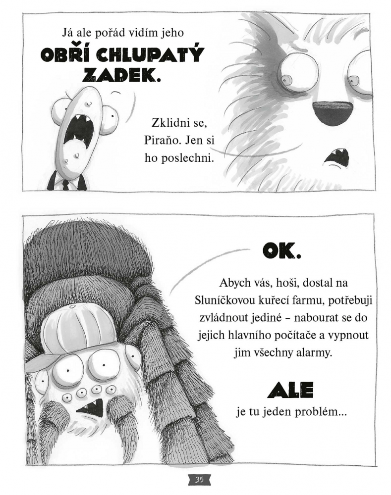 Aaron Blabey si byl nejspíš celkem vědom toho, že se stejnou zápletkou úplně neuspěje, a tak se ji pokusil oživit. A udělal vlastně to, že si utahuje z heist, tedy zlodějských snímků a filmů jako „Mission: Impossible“ - jsou zde scény, které v podstatě přímo parodují některé pasáže z filmu. Je to docela fajn, ale není to nic nového. Těch parodií je rozhodně více, i když víc jsme jich asi mohli vidět na plátně než na stránkách komiksů. Zápletku bere Blabey vážně, a tak to skutečně vyznívá úsměvně, ale nejsem si jistý, jestli je tohle něco, co ocení i děti. Pro ně je to jen další záchrana nějakých zvířátek, která má hodně podobné prvky jako v knize „Zlouni 1″. Oživením je pak přidání dalšího člena týmu, který všemu dává trochu modernější pojetí. Nožka je docela fajn postava. Skoro si říkám, že je škoda, že jsou všechny postavy prezentovány jako mužské pohlaví. Ženské by mohlo být dalším prvkem pro oživení.