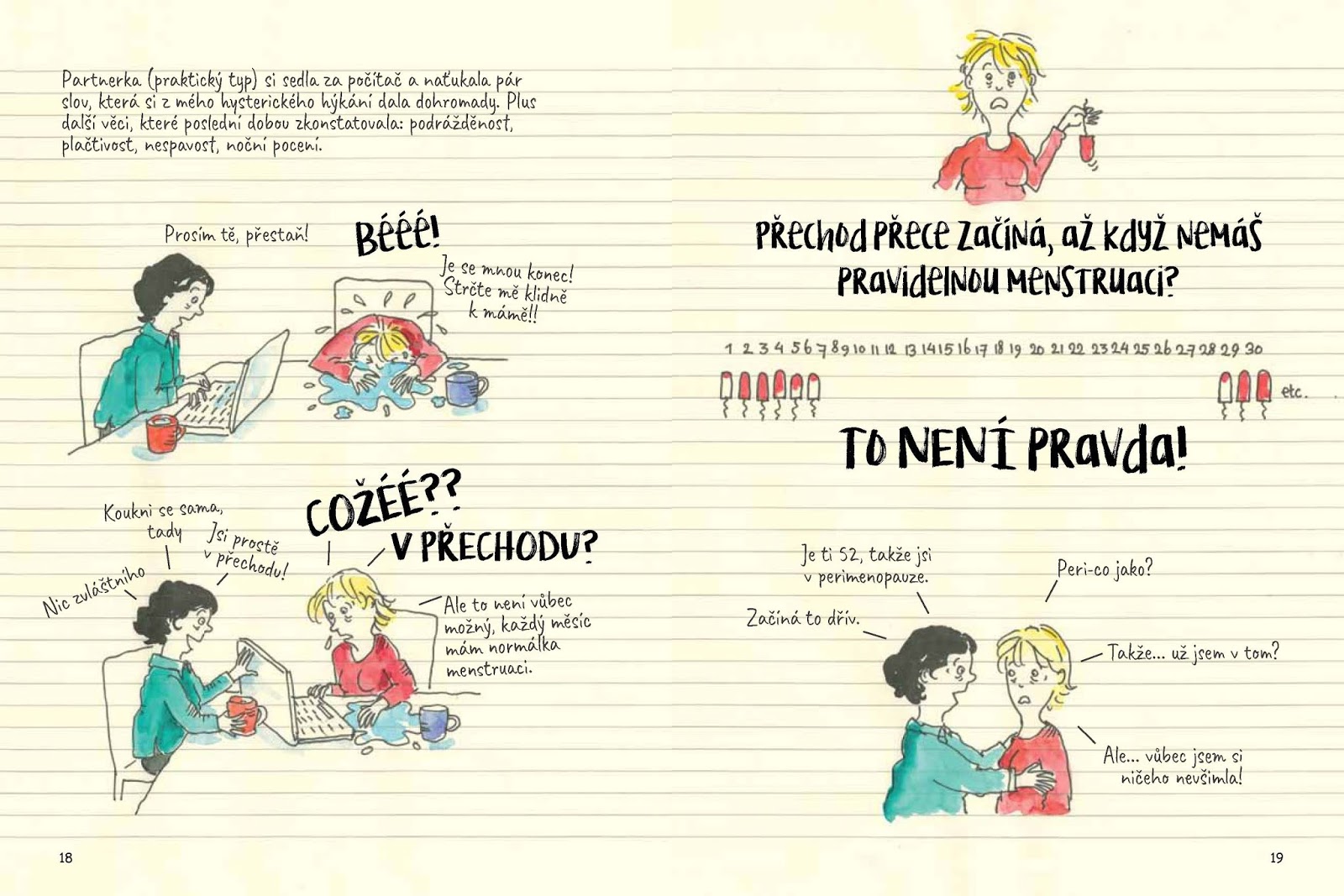 Ne, opravdu jsem mnoho knih o přechodu doposud nečetl. Vlastně nejspíš žádnou. Není to téma, které by mě krátce po třicítce trápilo. I když je mi jasné, že přechod se může týkat i mužů, i u nich dochází k hormonální nerovnováze, tak nějak doufá, že mám ještě dvě desítky let klid. A že to nebude tak náročné, jako se to projevuje u žen. Anebo o tom chlapi prostě nemluví. Či to považují za standardní součást stárnutí. Jak chlap nemá menstruaci a vše s ní spojené, tak vlastně ani pořádně neví, co to jsou hormonální problémy. Když jsem otevíral knihu „Jízda na vlnách“, vlastně jsem tak ani pořádně nevěděl, do čeho jdu. Ale musím říct, že se mi nesmírně líbily ukázky. Ne že bych je četl, ale prostě grafická podoba knihy mi přišla skvělá. A pak jsem knihu „Jízda na vlnách“ otevřel... A dostal jsem přesně to, co jsem očekával.