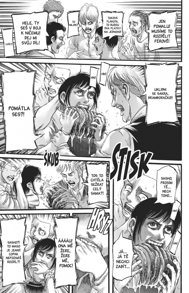 Druhá polovina knihy je mnohem zajímavější, a co si budeme povídat, je to hlavně tím, že už se zde něco děje. Teď to myslím tak, že dochází k nějaké akce. Průzkumníci jdou do boje a zase sviští vzduchem. Musím uznat, že to vypadá dobře. Jako kdyby se celá série rozpohybovala. Tady bych ale měl komentář k Isajamově kresbě, která v některých panelech vypadala nesmírně toporně. Jako kdyby se mu pořádně nedařilo zachytit pohyb. Jasně, tohle je něco, co se s kresbou vláčí celou dobu, ale má to něco lehce z expresionismu, což se mi prostě líbí. Ale u knihy „Útok titánů 18“ jsem si u několika panelů říkal, že to je takové nějak nepružné, statické, že to prostě nevypadá dobře. Jako kdyby to tvůrce už ani nebavilo kreslit. Budu se ale opakovat, akce tomu trochu pomáhá, možná i proto, že se stránky rychleji čtou.
