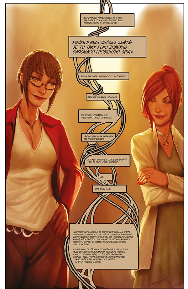 Proč tak dlouhý úvod? V podstatě jen proto, abyste nad „Sunstone 1“ nelámali hůl hned ve chvíli, kdy se dozvíte o tom, že tohle je BDSM komiks navíc s tím, že hlavní postavy jsou hrdinky a jejich vztah je tak lesbický. „Sunstone“ tu není proto, že by to bylo čtení pro úchyly, „Sunstone“ je tu proto, aby ukázal, že lidé, co mají rádi BDSM jsou prostě obyčejnými lidmi, kteří mají jen trochu jiné záliby. A myslím, že i mezi „normálními“ je dost těch, kdo by si rádi vyzkoušeli nějakou tu BDSM praktiku, ale jen se bojí toho, že by se na něj druzí dívali divně. Není to smutné, jak společnost sama v sobě různými předsudky zakořeňuje nesmyslné strachy, které jen vedou k tomu, že se lidé bojí naplnit své touhy, které vlastně nikomu neubližují, ale které mohou sdílet s ostatními? Ne, poslání komiksu „Sunstone“ není změnit, ale chce podávat obraz o tom, jak opravdu může vypadat submisivní/dominantní touha.