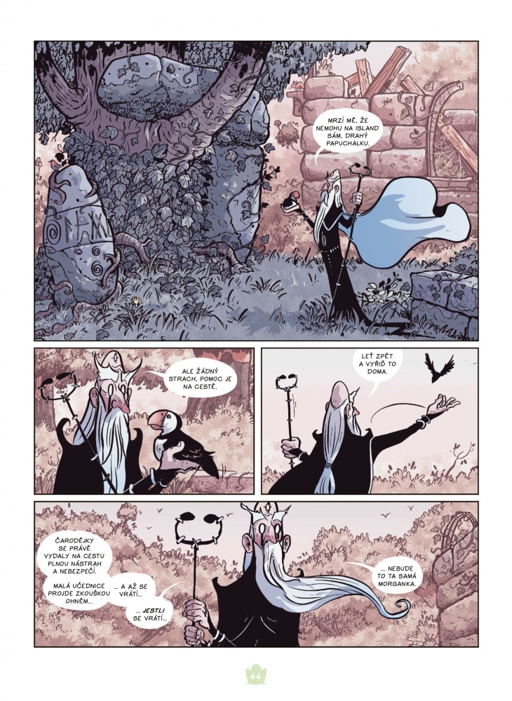 Kdo je to Morgavsa Jasnozřivá? Je to jedna starší čarodějka, která má pod palcem část lesa a přilehlé vesnice, kde se stará o pořádek a pomáhá místním. Žije v Merlinově době a děj se tedy odehrává v Británii, což je prvek, který se sem tam do děje promítne. Nenuceně, ale účinně. Především jsme ale v lese, chtělo by se říct druidském lese, kde se Morgavsa stará o malou dívenku, která jí byla svěřena samotným Merlinem. Tou dívkou je Morgana. Je to trochu uličnice, je nepořádná, je zbrklá, ráda domlouvá, ale jinak je to celkem hodná holka, která má ráda svou učitelku, stejně jako všechny tvory kolem sebe. Sama by se chtěla stát čarodějnicí, i když zatím jí dělá problémy byť i jen rozeznat barvy jednotlivých lektvarů. Ke kouzlům ale přece jen bude muset přičichnout, protože tomu tak okolnosti budou chtít.