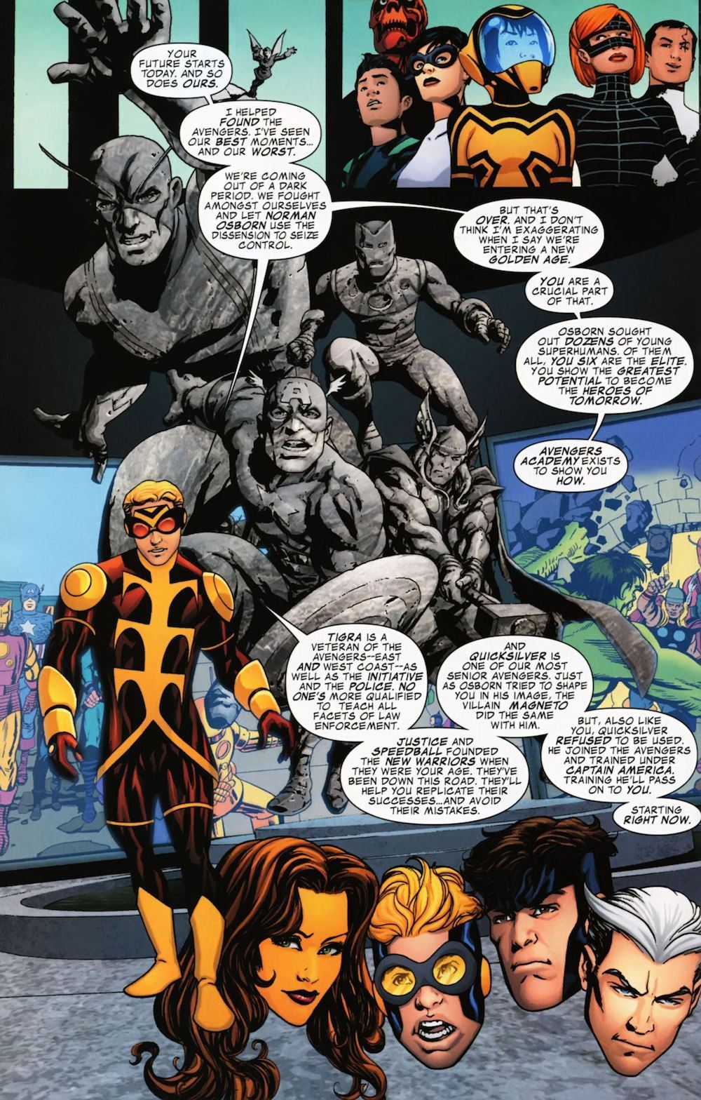 Takže tu máme šestici mladých hrdinů, kteří se těmi superhrdiny teprve stát mají. Anebo z nich budou padouši? Tohle je takové to hlavní dilema, které celá série má a která je nosným kamenem „Akademie Avengers“. Přiznám se, úplně mi to nestačí, hlavně proto, že tohle téma není v knize „Nejmocnější hrdinové Marvelu 68: Akademie Avengers“ nějak zásadně rozebráno, protože dějově je komiks velmi pomalý a k nějakým zásadním zvratům a posunům zde nedochází. Sledujeme celkem zajímavou partičku, ale vlastně ve všech šesti sešitech jde jenom o to, abyste se seznámili šesti jednotlivými protagonisty - Veil, která se dokáže měnit v jakýkoli plyn, Finesse, která je schopná se naučit cokoli a vše si pamatuje, Hazmat vyzařuje radioaktivitu, Mettle vypadá jako syn Red Skulla a Colossuse, Reptil se dokáže měnit na jakéhokoli dinosaura nebo alespoň změní část svého těla, a nakonec je zde Striker, který ovládá elektřinu.