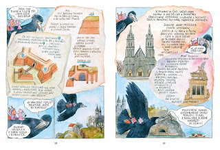 Komiksy v knize „Veverka a Myška v Praze“ stojí na jednoduchém principu - Veverka a Myška, dvě kamarády, se vydaly za babičkou do Prahy a díky havraní cestovce mohou navštívit zajímavé pražské památky. A že jich zrovna není málo. Trochu mě překvapilo, že se zde jede na klasiku, případně památky, které se na první pohled nejeví až tak zajímavé. Je zde Pražský hrad, kterému je věnováno nejvíce prostoru, ale dojde i na Karlův most nebo Staroměstské náměstí. Pak jsou zde ale také památky jako Faustův dům nebo Valdštejnský palác. Nejsou to špatné památky, ale zrovna třeba u Faustova domu jsem si říkal, že tam je proto, aby mohla být součástí knihy legenda o Faustovi. Jiný důvod to moc nemělo. A u Valdštejnského paláce mi zase přišlo, že je tam až moc faktografických informací a ta památka sama o sobě až tak zajímavě podaná není. Ale asi by stálo za to si ji pořádně prohlédnout v reálu.