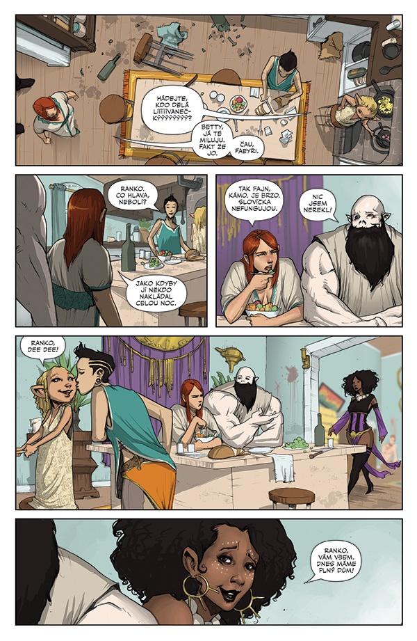 Čtveřice se sice musí nejprve vypořádat s houbovitými potvorami, ale teprve návrat do města jim ukáže že je tu něco, respektive někdo, kdo je skutečně nebezpečný a na koho žádné peníze stačit nebudou, protože se ho budou muset zbavit prostě proto, že by jinak všechno zničil. A to se mu docela daří, protože z nebe, jakoby z jiného prostoru, se na město snáší obří chapadlovitá stvoření. Ano, v knize „Krysí královny 1: Šmrncem a magií“ byly určité náznaky toho, že by se scenárista mohl inspirovat v tvorbě H. P. Lovecrafta, ve druhém díle už je to ale řečeno naplno. Ať už houbovité potvory nebo pak stvoření snášející se z nebes, jsou jasným odkazem na tvorbu hororového mistra a jen další ukázka toho, jak moc nadále Lovecraft ovlivňuje všechny generace. A přitom Wiebe používá dílo autor, který jako by neměl smysl pro humor, v komiksu, který se o humor velmi silně opírá. Prvky z Lovecrafta je prostě možné pojmout různorodě.