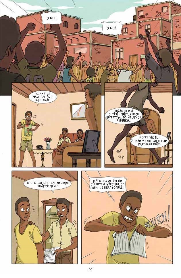 Pelé, který se narodil 23. října 1940 jako Edson Arantes do Nascimento, je jednou z největších osobností světového fotbalu. Asi každý fanoušek kopané ho bude znát, a to i přesto, že své nejlepší roky měl v době, kdy současní fotbalisté ještě ani nebyli na světě. Alespoň v 99 % případech. Pelé je jednoduše legenda, který zase tolik není. Tak, jak se dnes šílí kvůli Messimu a Ronaldovi - ano, pořadí je záměrné - tak se šíleli i kvůli tomuhle na první pohled obyčejnému chlapci, který neměl daleko k tomu, aby se narodil ve Slumu. Místo toho žil jen v malém městě. Chudoba ho však neminula. Jeho rodina měla k bohaté daleko a moment, kdy Pelé dostal svůj první skutečný míč, je pro něj tak památnou, že je i úvodní scénou celého komiksu. A i přesto, že se z něj stala hvězda, udržel si svou pokoru. Nebo to nám alespoň chce komiks „Pelé: Král fotbalu“ sdělit.