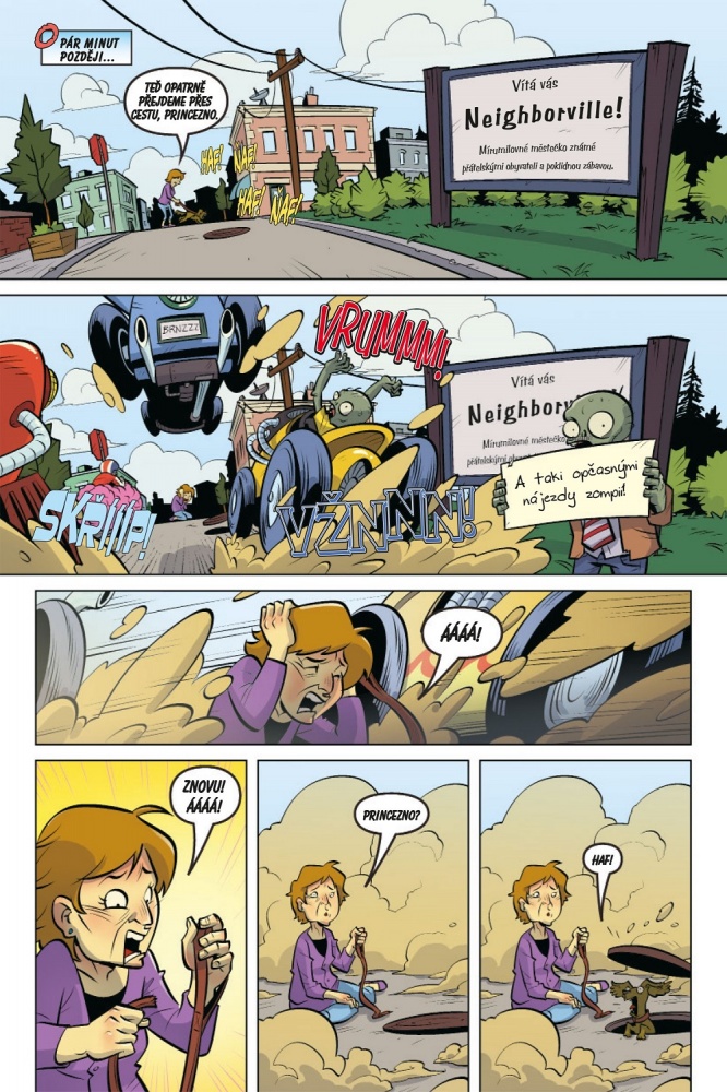 Jasně, možná jsem se nesmál nějak moc nahlas, i když to možná bylo tím, že jsem knihu četl na nemocničním lůžku, kde se mi prostě smát nechtělo. Ne že bych měl nějaký vážný stav, ale když je člověk v prostředí, kde jsou cizí lidé, což ve špitále většinou je, neprojevuje se tak hlasitě jako v soukromí. No, nebo alespoň já to tak mám. Takže i když jsem se nesmál nějak moc nahlas, kniha „Plants vs. Zombies: Železná jízda“ mě i tak bavila a minimálně jsem se hodně culil. Zase mi přišlo, že Paul Tobin měl skvělé nápady a doslova chrlil vtip za vtipem, v čemž mu pomáhal i Ron Chan, kreslíř hlavního příběhu. Komedie je tu opět prezentována slovem, ale i obrázkem a jeho některými detaily.