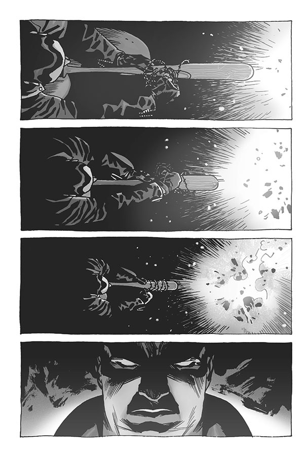 Na druhou stranu, kvůli knize „Živí mrtví: Teď poznáte Negana!“ si výrazně odlišný obrázek o Neganovi neuděláte, protože už jste stejně měli podobný. Negan je prostě celkem obyčejný člověk, který se hodně specificky přizpůsobil okolnostem, jež přišly se zombie apokalypsou. Ale pořád je to člověk, i když mluví jako dlaždič, i když čurákuje a píčuje, jako snad nikdo, koho jste v nějakém příběhu četli. A jo, tohle je něco, co mě na něm baví. V jednu chvíli už v knize „Živí mrtví: Teď poznáte Negana!“ zachází trochu do trapnosti, ale ono to nevadí, i to je definování je ho postavy, i to je jeho osobnost. Je dobře, že příběh „Živí mrtví: Teď poznáte Negana!“ tvořili opět Robert Kirkman a Charlie Adlard, protože to má hezké návaznosti, hezké souvislosti a zapadá to do světa. Docela by mě ale zajímalo, jestli by to fungovalo, i kdyby to psal a kreslil někdo jiný.