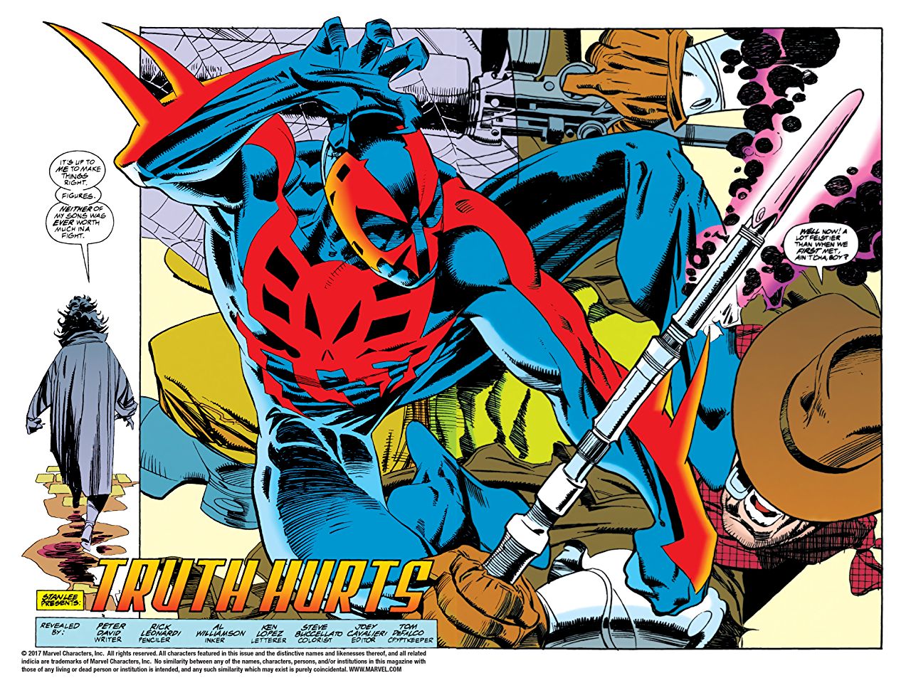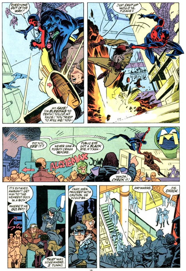 Spider-Man z roku 2099 se jmenuje Miguel O’Hara a - překvapivě! - je to mladý génius, který pracuje pro velkou korporaci na výzkumu, který je spojen s pavouky, i když okrajově, vlastně jde jen o to, že se pracuje s geny a ty je schopen upravovat. Jenže jakmile Miguel zjistí, že společnost Alchemax používá - nelegálně a nemorálně - ke svým experimentům i lidské jedince, rozhodne se, že skončí. Jenže to by ho šéf společnosti v tu chvíli nesměl nadrogovat a jeho přímý nadřízený zase nesměl sabotovat jeho experiment, jímž se chtěl Miguel zbavit drogy v těle. Sabotáž vede k tomu, že se u Miguela začnou objevovat schopnosti pavouka. Tohle je prostě jen propojení vzniku Spider-Mana a Green Goblina v jednom. Tedy nic nového. Peter David má trochu lépe vymyšlené pavoučí schopnosti, než je měl Stan Lee, ale ani to nic nemění na tom, že se jen držel konceptu, s ničím skutečně novým nepřišel.
