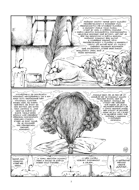 Na komiksu „Justina“ je trochu škoda to, že některé postavy jsou nerozeznatelné. Přiznám se, že v některých scénách mi vizuální podoba nestačila k tomu, abych poznal, která z žen je Justina. Naštěstí z děje se to dalo celkem pochopit. Příběh je pak vyprávěn celkem chronologicky, kromě začátku. Pak je to ale slet jednotlivých scén a událostí, které jako kdyby Justinu vrhaly do stále horší a horší situace, jako kdyby sama byla magnetem na lidské průsery. A tohle dokáže Crepax skvěle zachytit. Jako kdyby se Justina neměnila, ale psychicky je na tom stále hůře a hůře. A do toho je součástí skutečně krásně nakreslených erotických scén. Myslím si, že komiksové zpracování legendárního díla Markýze de Sade je celkově stravitelnější, ale s tím, že myšlenky, jež měl Markýz ve svém prozaickém díle, zde zůstaly zachovány. Docela by mě zajímalo, jestli by v dnešní době, pokud by byla „Justina“ napsána nyní, byla stále brána jako tak kontroverzní, či nikoli.