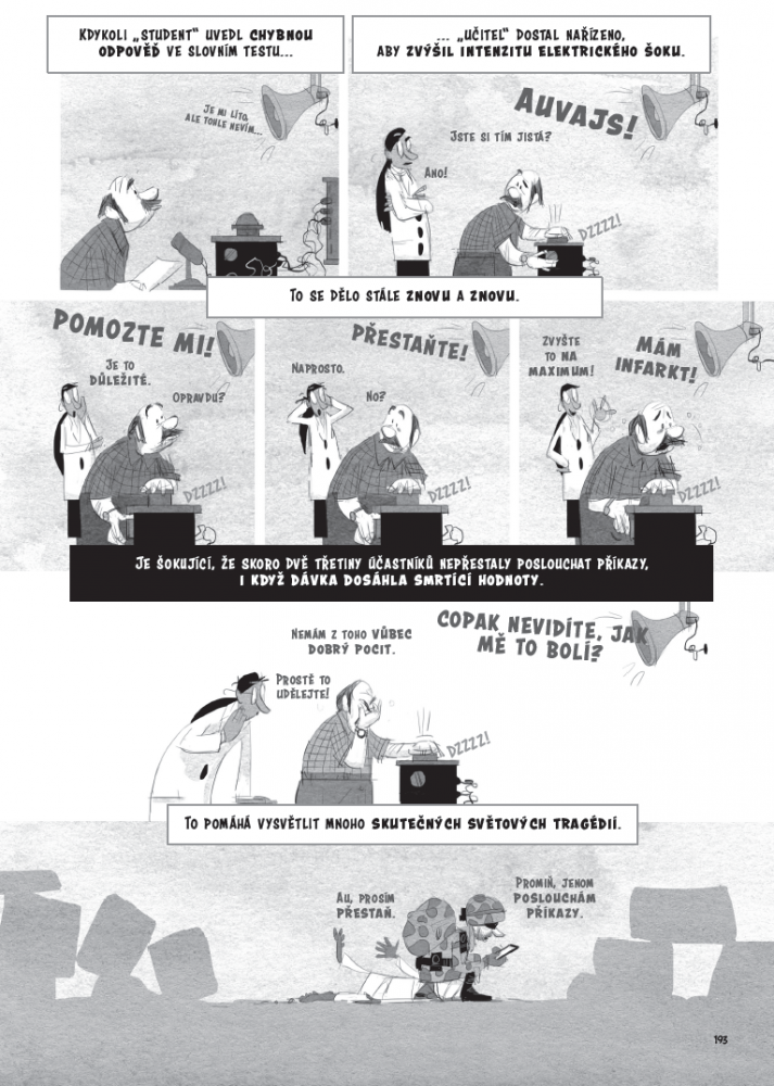 Jasně, sem tam se stane, že tvůrci sklouznou k tomu, že do ilustrace skutečně jen vloží vtípek, o nic jiného nejde, jen takové mrknutí na čtenáře, ale jindy je ten vtip prezentován tak, aby pomohl pochopení látky, jež není úplně jednoduchá, ale díky komiksovému zpracování se zdá na pochopení snazší. Ale je to dáno i tím, že se nás Danny Oppenheimer nesnaží zahltit fakty a údaji, opravdu se jen snaží o to, abychom mohli nahlédnout do problematiky psychologie, do základního pochopení toho, jak vlastně naše mysl funguje. A to se mu daří. Činí tak ve dvanácti kapitolách (plus úvod a závěr), které se zabývají lidskou psychikou od vnímání a pozorování přes paměť až po stereotypy, které si vytváříme a které jsou problematické ve chvíli, kdy se jedná o stereotypy negativní. V závěru si uvědomíte, jak nám psychologie skutečně dovede pomoct nejen pochopit, proč myslíme, jak myslíme, ale i proč je lidstvo v takových sračkách. Přitom si ani neuvědomíte, jak jednoduché takové pochopení je, dokud vám to někdo neřekne.