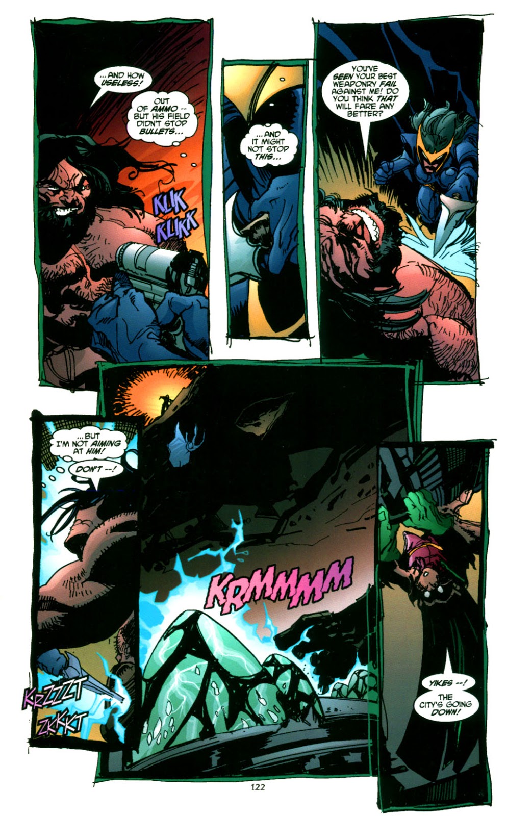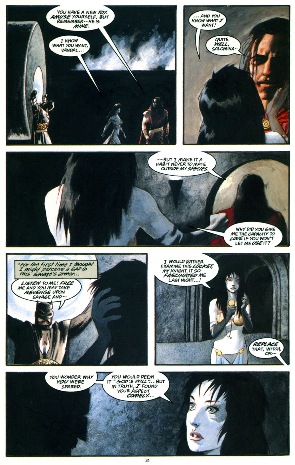 Pokračuje se pak v příběhu ze současnosti, kde se jen ukazuje, že tady nebylo moc těžké na něčem stavět, vzalo se pár prvků, které jsou ze světa klasického Batmana, do toho se zase vhodil Vandal Savage, který se už zde ukazuje jako příšerně nudný a průhledný záporák, alespoň z hlediska čtenářského, aby pak přišel závěr, kde je snad nejlepší scéna z celé knihy. Kvůli ní ale nestojí za to číst tolik stránek. Naštěstí Mike. W. Barr uměl šetřit slovy, a tak vás stránky nezahltí. Pak následuje příběh z budoucnosti, a to už je krize příšerná. Tady už vás nebude bavit děj, který je tak divně zkratkovitý, zvláštně se zde skáče, jako kdyby psal komiks trochu jiný scenárista. A možná tomu pomáhá, respektive škodí kresba, která moc nedává prostor tomu, aby čtenář pochopil, jestli je děj současný, nebo postava na něco vzpomíná. A co si budeme povídat, kresba samotná, spolu s kresbou předchozí části, rozhodně nenadchne. Vlastně spíše otravuje a moc hezky se na ni nekouká. Tady byl neskutečný prostor pro sci-fi hýření, ale autorův styl tomuhle nepřál. Žádná futuristická velkolepost se nekoná.