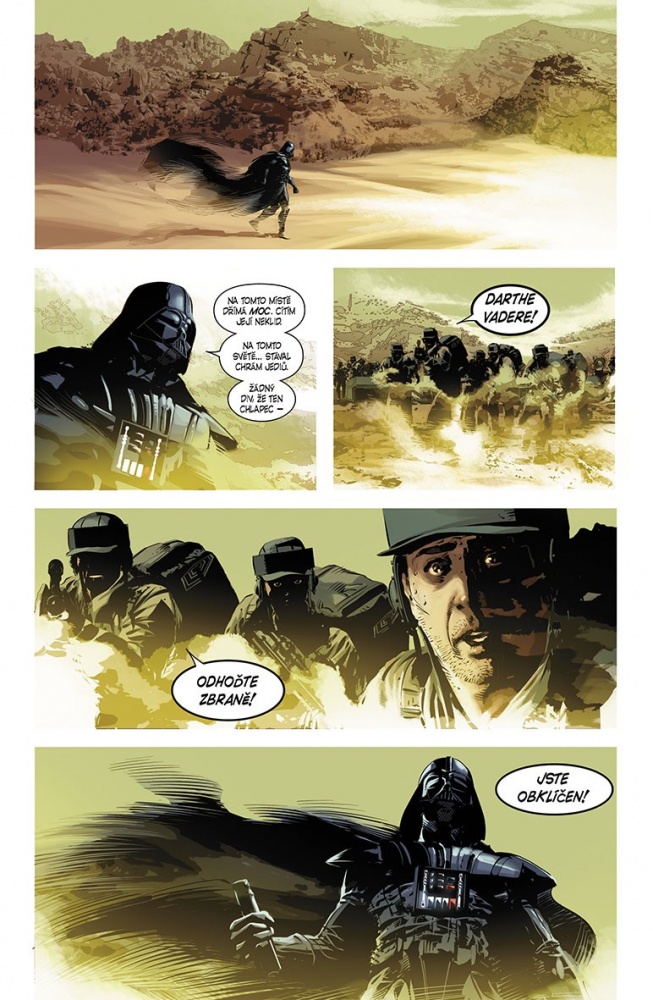 První příběh, „Vader sestřelen“, je podle názvu takový celkem jednoduchý, a podle vývoje na tom nic moc víc není. Přiznám se, že kdyby tohle bylo minimálně o dva sešity kratší, asi bych se vůbec nezlobil. Vader je sestřelen Lukem a to tak, že oba končí na planetě, kde jim jde o život. Vaderovi proto, že jsou tu rebelové, kteří chtějí zachránit Luka, Lukovi proto... no prostě proto, že je tam Vader. Luke chtěl objevit starý jediovský chrám, ale kolem něj jen projde. Mimochodem, tohle je něco, co mě na „Star Wars“ vždycky nejvíce zajímalo a co jsem nikdy nedostal. Podívat se do minulosti, zjistit něco víc o tom, jaká byla minulost Jediů. Jsem si skoro jistý, že se to v některých vedlejších příbězích, ať už knižních nebo jiných možná objevilo, ale mě by tohle zajímalo v těch hlavních filmech. Prostě víc odhalit z minulosti řádu, nesoustředit se jen na současnost, přijít s dalšími legendami, třeba objevit nějaká obrovská tajemství... Tak třeba někdy.