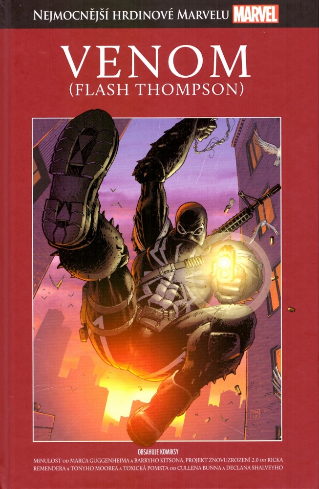 Venom už není jen něco, co se snaží parazitovat na svém hostiteli, i když to dělá pořád, už je to něco, co se snaží jeho hostitel ovládnout. Flash Thompson má utkvělou představu, že on vlastně není pod vlivem symbionta, že ho dokonale ovládá. V současné době, tedy v době dění knihy „Nejmocnější hrdinové Marvelu 77: Venom (Flash Thompson)“, je Flash Thompson už mimo armádu a symbionta má v sobě. Přestěhoval se do Filadelfie, aby zde šířil spravedlnost a stal se vlastně temnější verzí Spider-Mana v trochu jiném městě. Malinko budete mít pocit, že tvůrci v hlavním příběhu šli cestou Batmana v některých jeho příbězích. Ale přitom stále cítíte, že tohle je vlastně primárně pořád Spider-Man, i když má černý kostým. Opět se řeší sociální problémy, Flash se pro jistotu stává i učitelem, vlastně asistentem učitele, konkrétně tělocviku, což se vzhledem k jeho stavu může zdát trochu paradoxní. Ale proč ne...
