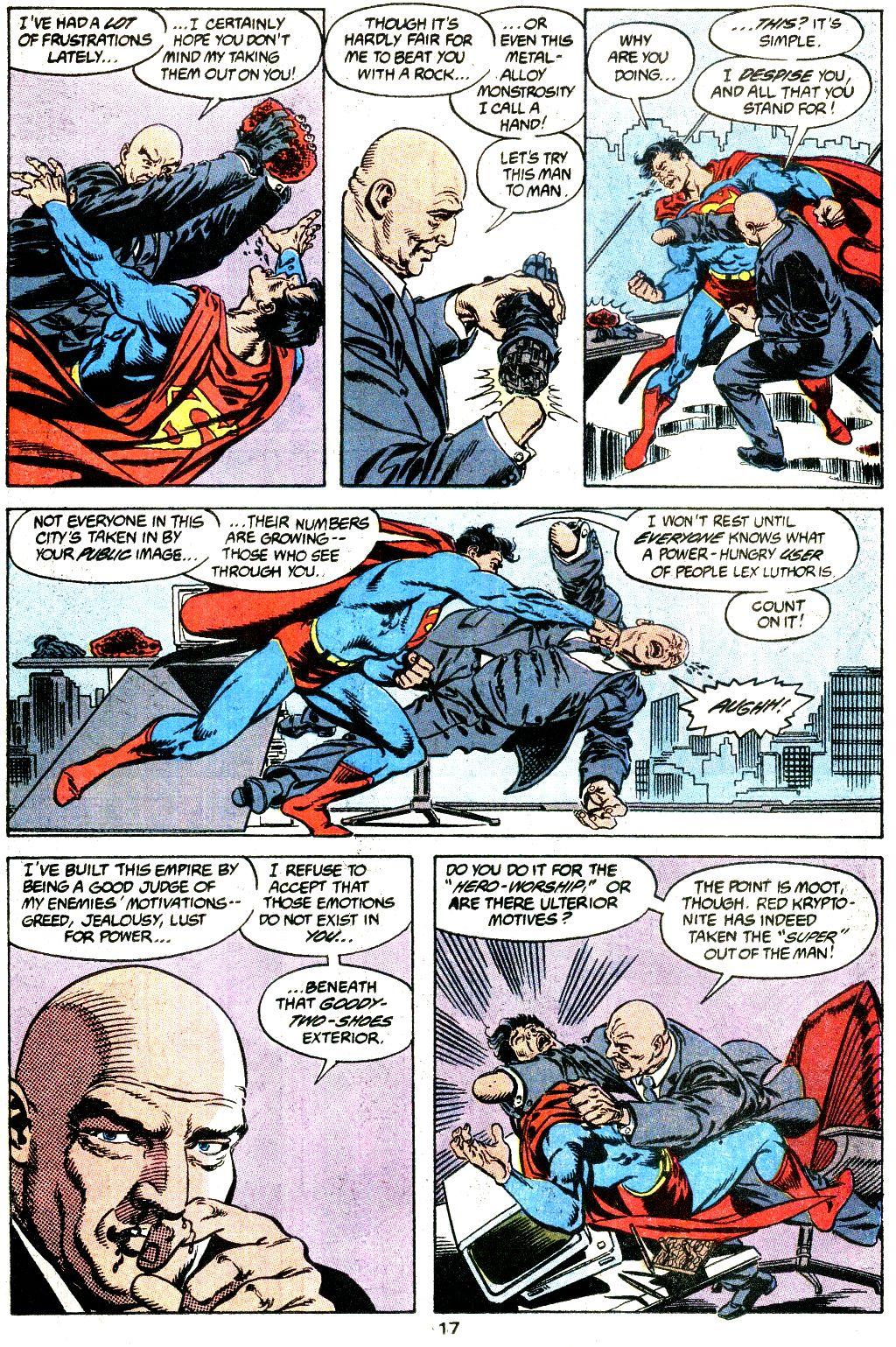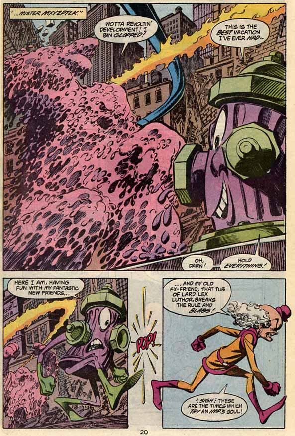 Zelený Supermana oslabuje natolik, že by ho mohl zabít, červený mu pak bere jeho schopnosti, a to natrvalo. I když... Tady to najednou celé začíná kulhat, a to pořádně. Kde se červený kryptonit vlastně vzal? Dostal ho do ruky Lex Luthor, který v té době nemá jednu ruku, tedy vlastně dlaň, i když si ji rychle vyměnil za robotickou náhradu, a mimochodem také umírá na rakovinu z ozáření, kterou - ironicky - dostal z toho, že sám sebe vystavil radioaktivnímu zelenému kryptonitu. Jenže on rudý kryptonit nevytvořil, ten se k němu dostal jako jeden z vtípků Mr. Mxyzptlka. A tady už příběh pořádně padá na hubu, protože zrovna Mr. Mxyzptlk je jednou z nejblbějších postav Supermanova univerza. Všechno, co dělá, je vlastně jen sranda. Jen se to musí vzít za správný konec a neporušit pravidla. Anebo je porušit. Záleží, co chcete dosáhnout a jaká jste strana. On přinesl Lexovi rudý kryptonit, ale v konečném zúčtování to vypadá, že on ovlivňuje, jak a jestli bude působit. A tak si člověk říká, proč vlastně byla taková berlička, jako je červený kryptonit, třeba. Ten příběh by se obešel i bez něj. Jako kdyby tvůrci chtěli rozšířit počet bizarností v Supermanově světě o další, a to v době, kdyby čtenář čekal, že budou spíše ubývat.