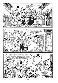 Kniha „Usagi Yojimbo 32: Záhady“ obsahuje celkem čtyři příběhy, které byly původně rozdělené do sedmi sešitů a k tomu ještě dva krátké bonusové komiks s Chibi Usagim, což je taková ta karikovaná verze Usagiho, která je roztomilá a má velkou hlavu. nás ale přece jen budou více zajímat ty dlouhé příběhy, přece jenom, to, co prezentuje Chibi Usagi jsou spíš jen takové milé bonusy. Knihu „Usagi Yojimbo 32: Záhady“ otevírá komiks „Hatamotova dcera“ a otevírá ho rovnou dramatickou scénou. Muž s malou dcerou uniká lesem, ale nedokáže zmizet. Naštěstí se dívka schová, než jejího otce zabijí. A dívku nalezne - jak jinak - Usagi. Ten ji dovede do města, kde je inspektorem Ishida a společně případ řeší. Stan Sakai tak vlastně příběh použil nejen k vyprávění detektivní zápletky, ale i tomu, aby dostal Usagiho do společnosti Ishidy na delší dobu. To se ukazuje i v dalším příběhu, pojmenovaném „Smrtící fugu“. V mysli mi uvízl nejvíce, protože Stan Sakai zde skvěle používá jedno z japonských specifických jídel pro zápletku, která je velmi dobře vygradována.
