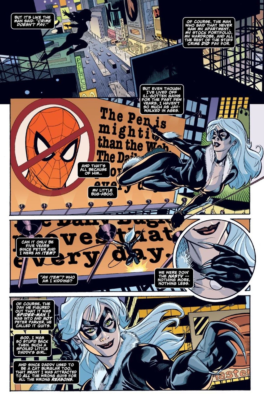 I když by takový příběh mohl lehce sklouznout k tomu, že se budou Black Cat a Spider-Man špičkovat, že se budou snažit nějak navázat na svůj minulý vztah, i když Peter už je ženatý a zamilovaný. A tohle je téma, které zde rozhodně je, ale je to pouze okrajové, je to něco, co se zde odehrává v pozadí. Do popředí se dostává dramatický příběh, a to jak tím, že zde umírají lidé, tak proto, že se vrací minulost nějakých postav, kterou musejí konfrontovat, ať už samy, anebo s jinými, kteří se snaží překonat svou minulost a nějak dál žít. Na komiksu je vidět, že se z poměrně zábavného, skoro až mainstreamového, postupně mění v něco, co má větší hloubku, tedy především psychologickou. A zase se prokazuje, že Kevin Smith, pokud píše komiks, tak rozhodně není takovým vtipálkem, jako v případě svých filmů. Raději se věnuje tomu trochu temnějšímu, co může být s postavami spojováno. A sakra mu tahle temnější vlna sedne.