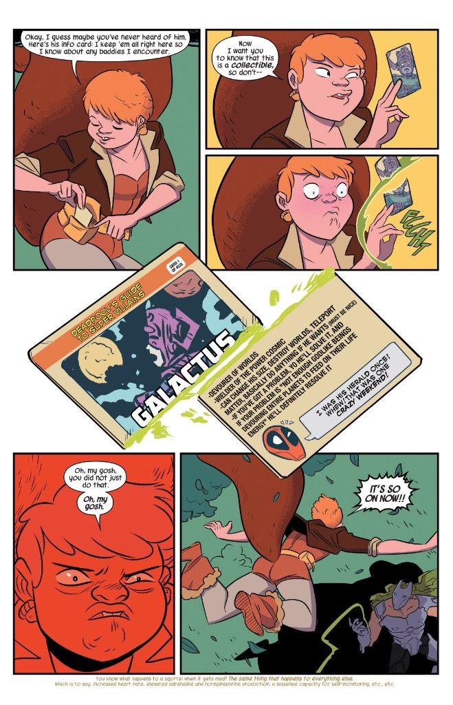 Komiksy v knize „Nejmocnější hrdinové Marvelu 84: Squirrel Girl“ jsou zábavné, někdy moc tlačí na pilu, ale někdy jsem se skutečně smál. A to je super. Stačí mi to. Když má být příběh vtipný, měl by se člověk smát. A pokud jsem se alespoň párkrát zasmál, tak rozhodně trochu vtipný byl. Mohu tedy s klidem říct, že mě kniha „Nejmocnější hrdinové Marvelu 84: Squirrel Girl“ bavila, a to i přesto, že je tu hodně cítit, že tvůrci chtěli přijít s něčím, co by bylo jako Deadpool, jen spíš pro mladší čtenáře. Není to tak drsné, skoro se zde nebojuje a každá stránka se snaží být vtipná. Někdy je toho moc, je někdy je to tak akorát. Je ale příjemné, že se pracuje i s dalšími hrdiny, ale ti jsou tu jen jako odkazy, cosi mimo kameru a tolik se do dění nezapojují. Squirrel Girl je natolik specifická, že si zaslouží co nejvíce prostoru pro sebe. Pátý díl její samostatné série, tedy poslední sešit v knize „Nejmocnější hrdinové Marvelu 84: Squirrel Girl“, pak ukazuje, kde je její síla - dělat si srandu ze všeho a ze všech. Především i ze sebe.
