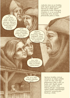 Když jsem zjistil, že existuje kniha „Českobudějovické pověsti“, musel jsem si ji koupit. Trochu mě překvapilo, že mě kniha minula, i když je již na trhu dva roky, ale jsem rád, že se ke mně dostala. České Budějovice sice nejsou moje rodné město, ale přece jen se v něm poslední dobou nacházím docela často, je mi blízké, a tak jsem byl zvědavý na to, jaké pověsti jsou s ním spojené, protože - co si budeme povídat - nikdy jsem si tohle více nezjišťoval. Navíc v komiksovém provedení v kresbě, která se mi na první pohled zamlouvala. Nejsem si jistý, jestli se jednalo o uhel, ale i tak jsem byl nadšený z toho, jak dobře v něm postavy vypadají. Ale i tak jsem se víc těšil na informativní stránku komiksu, přece jen, když člověk nějaké místo zná, docela se těší na procházku po něm, která bude trochu jiná, než je zvyklý. A proč se nedovědět o tom, co znamená žába na Piaristickém náměstí, právě z komiksového provedení.