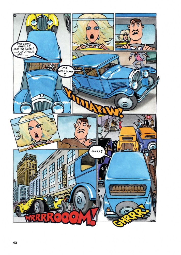 Knihu otevírá slovenský černobílý komiks „Dobrodružstvá Ťuťa Ďunďa“, který začíná jako sociální satira a mění se v satiru politickou, a to v neskutečně zběsilém organizování panelů, které má něco ze Saudka, ale rozhodně ne jeho přehlednost, kterou jste cítili v každé stránce. Prvním barevným komiksem v knize je „Konec staré struktury“, což je takové komiksové ohlédnutí se za pádem režimu. Zajímavý, skoro až kafkovský nápad, který ale mohl být vytištěn ještě před rokem 1989, to by byla teprve síla. Následuje Sheila od Bofa, tedy Bohumila Fencla, kde je také vidět Soudkův vliv, ale spíše v tom, jak je komiks vyprávěn, jak je používán humor. Fenclova kresba je ale specifická a osobitá. A taková je „Sheila“, jejíž druhý díl je zde mimochodem otištěn vůbec poprvé. A jo, bavil jsem se. Je to ujeté, je to sprosté, je to zábavné. Za mě jeden z vrcholů sbírky „Generace 89“. Tam bych asi klidně zařadil i komiks „Flip, Kastor & kouzelná škeble“, který má krásnou kresbu, jako kdyby byla určena spíše dětem, ale přitom parádně absurdní příběh. Takový trochu jiný čtyřlístkový komiks.
