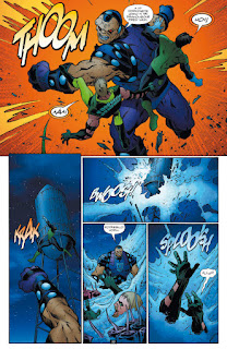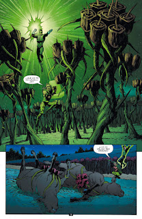 A pak následuje to hlavní, tedy „Pomsta Green Lanternů“. Je to příběh rozdělený do celkem čtyř sešitů a jde vlastně o to, že se má ukázat, že ani když zradil, nebyl Hal Jordan až takový sráč, protože docela dost těch Lanternů, které měl zabít, nějakým záhadným způsobem přežilo. A teď jsou v části vesmíru, která je i pro Sbory neprobádaná. Tohle je fajn, odhaluje se něco tajemného, objevuje se nová hrozba. A když je odhaleno, co to je za hrozbu, je to prostě zívačka. Pořád se ukazuje, že o světě Lanternů toho moc nevíme, a skutečnost, že je nám představen v textovém úvodu, prostě není dostatečná natolik, aby se člověk do těch „zásadních“ scén ponořil. A co si budeme povídat, ten záporák, který se tu objevuje, je bez nějaké hlubší znalosti předchozích příběhů celkem otřepaný. A jeho nástup, i když měl být jako hrozně cool, vyznívá prost jen jako ten moment, který byste označili nejspíš slovy: A co jako?