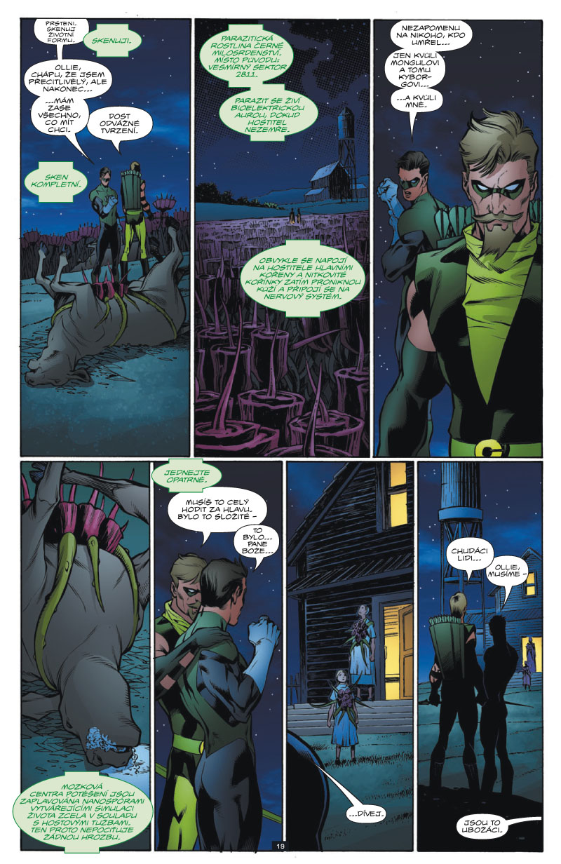 A pak následuje to hlavní, tedy „Pomsta Green Lanternů“. Je to příběh rozdělený do celkem čtyř sešitů a jde vlastně o to, že se má ukázat, že ani když zradil, nebyl Hal Jordan až takový sráč, protože docela dost těch Lanternů, které měl zabít, nějakým záhadným způsobem přežilo. A teď jsou v části vesmíru, která je i pro Sbory neprobádaná. Tohle je fajn, odhaluje se něco tajemného, objevuje se nová hrozba. A když je odhaleno, co to je za hrozbu, je to prostě zívačka. Pořád se ukazuje, že o světě Lanternů toho moc nevíme, a skutečnost, že je nám představen v textovém úvodu, prostě není dostatečná natolik, aby se člověk do těch „zásadních“ scén ponořil. A co si budeme povídat, ten záporák, který se tu objevuje, je bez nějaké hlubší znalosti předchozích příběhů celkem otřepaný. A jeho nástup, i když měl být jako hrozně cool, vyznívá prost jen jako ten moment, který byste označili nejspíš slovy: A co jako?
