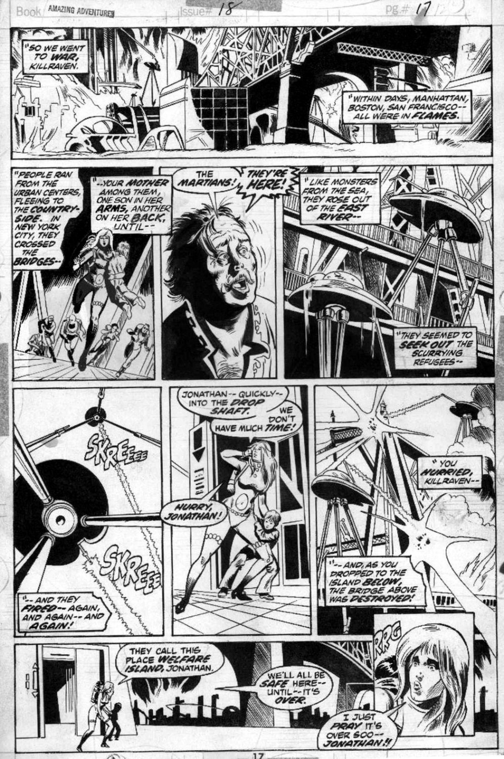 První komiks s postavou Killraven vznikl v roce 1973, a to jako součást sešitu „Amazing Adventures 18“. Série „Amazing Adventures“ byl takový ten klasický komiks, kde se objevovalo více příběhů, zkoušely se různé koncepty, novinky. Killraven se tu začal objevovat právě od čísla 18 a vydržel až do čísla 39, které bylo pro tenhle komiks i poslední. Shrnutí toho, co se dělo v jednotlivých číslech najdete na konci knihy „Nejmocnější hrdinové Marvelu 90: Killraven“, kde se jedná o textový bonus, jak je v téhle edici zvykem. Z „Amazing Adventures“ tu máme jen první dva sešity, což je jen základní shrnutí toho, že příběh Killravena se odehrává sto let a kousek po událostech, které byly popsány v románu „válka světů“. Mars tenkrát sice prohrál, ale po sto letech se vrátil a Zemi si zotročil. Killraven je jeden z gladiátorů a otroků - ano, trochu moc spartakovský motiv - který se ale osvobodil a teď bojuje proti uchvatitelům. Nic moc originální, ale popravdě to vypadalo jako fajn béčkové dobrodružství. Mimo jiné i proto, že komiksy byly v „Amazing Adventures“ kresleny černobíle. A to se k akčnímu béčkovému žánru skvěle hodí.
