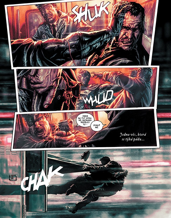 Jako kdyby byl Batman v knize „Batman: Zatracení“ jen kuličkou, která se valí herním automatem a sem tam se od něčeho odrazí, sem tam ji někdo odpálí. Ale svou vlastní vůli nemá. Jde jen o to, že si musí projít psychicky i fyzicky náročnými scénami, aby na konci vyšel jako... a já vlastně ani nevím. Ale jisté je, že na konci pořád žije a v hlavě má nejspíš pořád pěkně temno. A to je vlastně největší pozitivum celého komiksu. Dějově u není nic, co by vás mělo ba vit, John Constantine mi tu jako vypravěč vyloženě vadil. Snažil se zlehčit jinak celkem temný komiks. Prostě mi tam neseděl. Vše je ale naštěstí v kresbě Leea Bermeja, což je jednoduše velké plus tohoto komiksu. Budete si prohlížet jednotlivé panely, budete se jimi kochat. A naštěstí jsou tak dobré, že vám možná chvílemi i bude jednot, jaká slova jsou zde vepsána, protože sama kresba je tak dechberoucí, že si můžete komiks užít i bez toho, abyste porozuměli scénáři. A co si budeme namlouvat, pokud budete číst každé slovo, v tomhle případě to rozhodně není záruka toho, že budete od komiksu odcházet s tím, že jste s příběhem spokojeni a že jste ho pochopili.