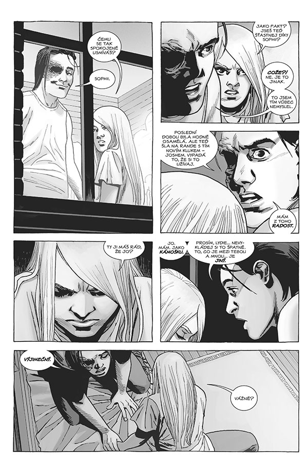 Nebudu lhát. Konec, který Robert Kirkman v knize „Živí mrtví 32: Odpočívej v pokoji“, mi nesedí. Představoval bych si jiný, popravdě bych si představoval klidně ten, který nastínil v doslovu. Jsem prostě pro jiný typ konců a tohle mi přišlo... No prostě to zakončil tak, jak by se očekávalo. Velké drama, ale v konečném důsledku happy end. Já bych raději to velké drama a pak ještě vzít poslední naději. Přesto má asi pravdu v tom, že by to tak dobře nefungovalo. Lidé si chtějí prožít emoce, a to se jim v knize „Živí mrtví 32: Odpočívej v pokoji“. V tom druhém konci... No asi by to byly trochu jiné emoce, nejspíš vztek a frustrace z toho, jak to skončilo. Nebude asi tolik lidí, jimž by se to zamlouvalo tolik jako mně. Takže to je jen takové jediné moje povzdechnutí, ale jinak nebudu lhát, zhltl jsem knihu „Živí mrtví 32: Odpočívej v pokoji“ na posezení a nemohl jsem se od ní odtrhnout, dokud jsem nedošel do konce.