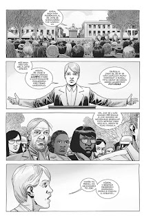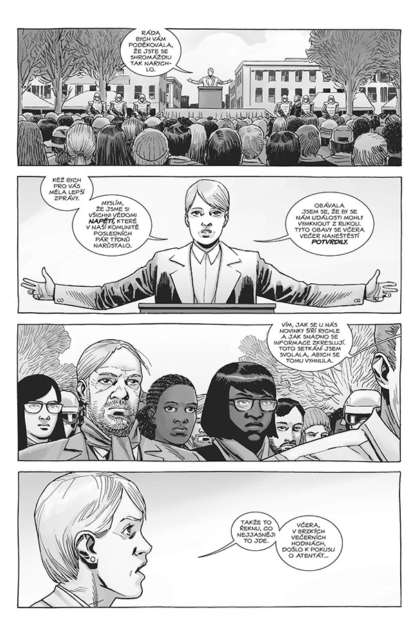 A teď je konec. Tak se mu pojďme trochu věnovat. Kniha „Živí mrtví 32: Odpočívej v pokoji“ je nejtlustší knihou v celé sérii, protože ta si udržovala za celou dobu celkem dobrý standard. Prostě šest původních komiksových sešitů, nic víc, nic míň. Tentokrát je těch sešitů sedm a ten poslední je navíc extra dlouhý. V knize „Živí mrtví 32: Odpočívej v pokoji“ se toho musí vyřešit docela dost, takže je pochopitelné, že trochu nabobtnala. V první řadě se musí vyřešit konflikt ve velkém Společenství. Jako kdyby Rick, kamkoli přijde, rozséval rozbušky, kterých se někdo chytne a nechá pak idylku vylétnout do povětří. I když pravda, on ten konflikt ve Společenství bobtnal už nějakou dobu, stačilo jen málo, aby to pořádně bouchlo. A tady to pořádně bouchá. Až dojde na úplný závěr a něco se ve vás zlomí. A pak je tu ještě poslední díl, který je výletem do budoucna, i když především ohlédnutím za tím, jak to s některými postavami dopadlo.