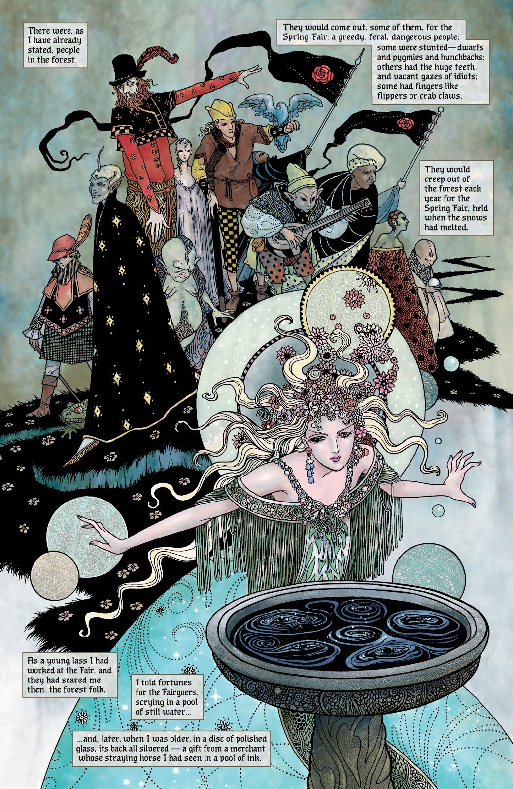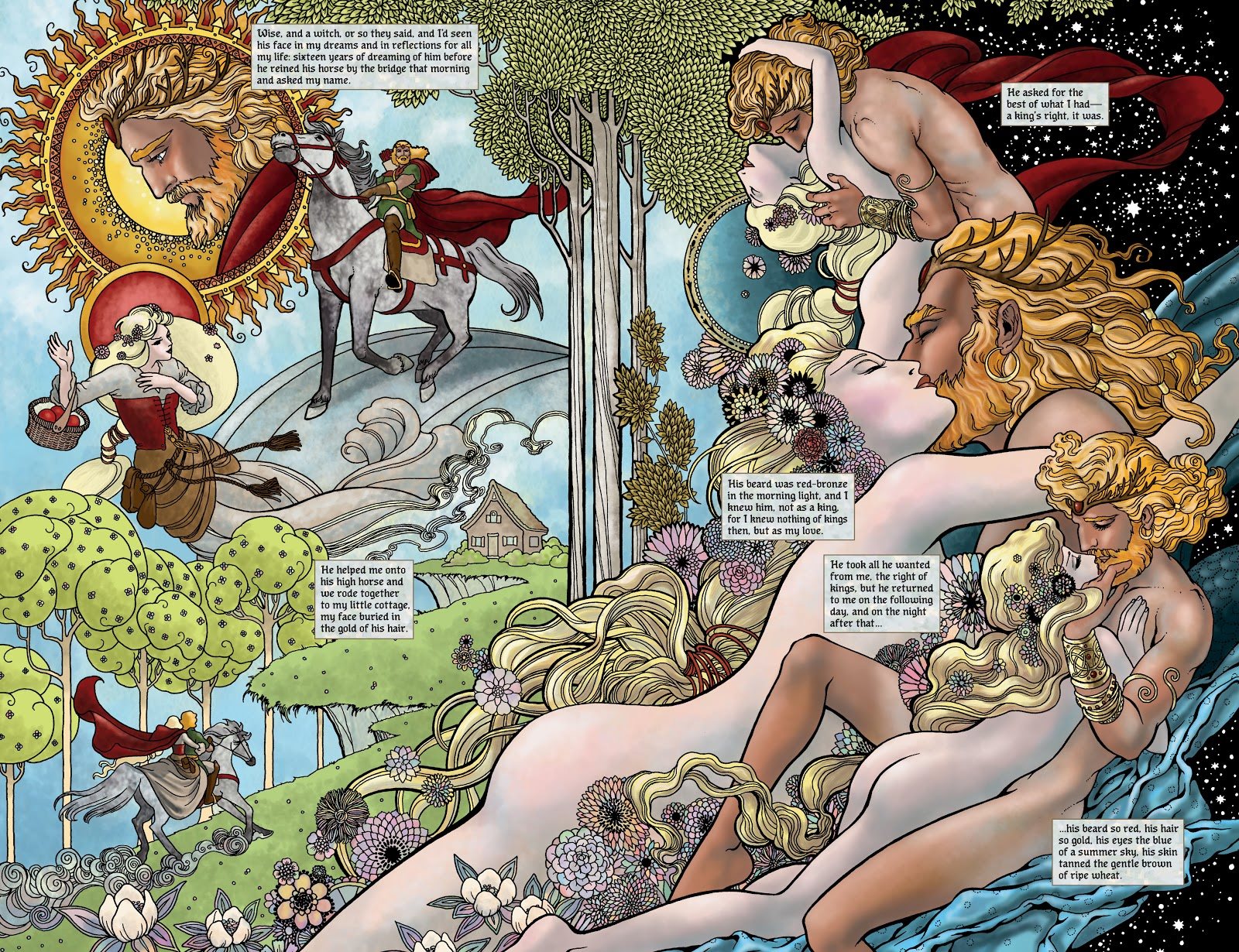 U mých recenzí obvykle začínám nejprve s hodnocením děje a s jeho klady i zápory. Teď nicméně udělám výjimku, neboť jako první začnu hodnotit výtvarnou stránku. Tu si na starost vzala zkušená kreslířka Colleen Doran, se kterou Gaiman v rámci své plodné komiksové kariéry již párkrát spolupracoval. Ta má velmi osobitý styl, jenž se v komiksech jen tak nevidí. Když budete listovat jednotlivými stránkami, začnete si uvědomovat jednu věc. Tohle rozhodně není typická kresba, neboť vyniká hned v několika směrech. Tím nejzásadnějším je rozvržení. Nevím, jak to vnímáte vy, každopádně já jsem si při čtení místy připadal jako v jedné velké galerii, a to až tak, že jsem se občas jednotlivými „obrazy“ kochal. Abych pravdu řekl, komiks jako takový byl už od začátku koncipovaný tak, aby hned zapůsobil na čtenáře. Proto není příběh vyprávěn skrz klasické panely, nýbrž prostřednictvím větších a propracovanějších maleb, jež mi připomínaly do detailů propracované fresky, tapiserie a klasické středověké obrazy. To „Snow, Glass, Apples“ šíleně napomáhá a zvedá jej o několik úrovní výše.
