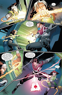 Thompsonová vsází především na svižné vyprávění okořeněné o funkční humorné scény. Ačkoliv je tempo občas přehnaně zběsilé, díky čemuž máte v některých chvílích pocit, že jste součástí šíleného akčního filmu, fungují jednotlivé složky komiksu na jedničku. Akčním scénám nechybí dynamika, což je výborně umocněno výtvarnou stránkou. Nejsou použity nuceně a mají vždy své opodstatnění v ději. Zároveň nejsou příliš uspěchané a mají spád. Samozřejmě, příběh není postavený jenom na zdlouhavých soubojích, a tak nám je prostřednictvím jednotlivých sešitů postupně prezentován vztah manželského mutantského páru. Jak jsem již psal výše, Gambita i Rogue zbožňuji, takže čtení vzájemných interakcí mezi nimi pro mě byl fantastický zážitek. Jde vidět, že Thompsonová má k těmto dvěma silné citové pouto, a z každé stránky, doslova z každého momentu to jde cítit. Dialogy jsou přirozené, nepůsobí lacině, přičemž synergie titulní dvojice funguje na jedničku. Coby čtenář nemáte pocit, že byste četli patos, a co víc, po dočtení si budete chtít přečíst pokračování.