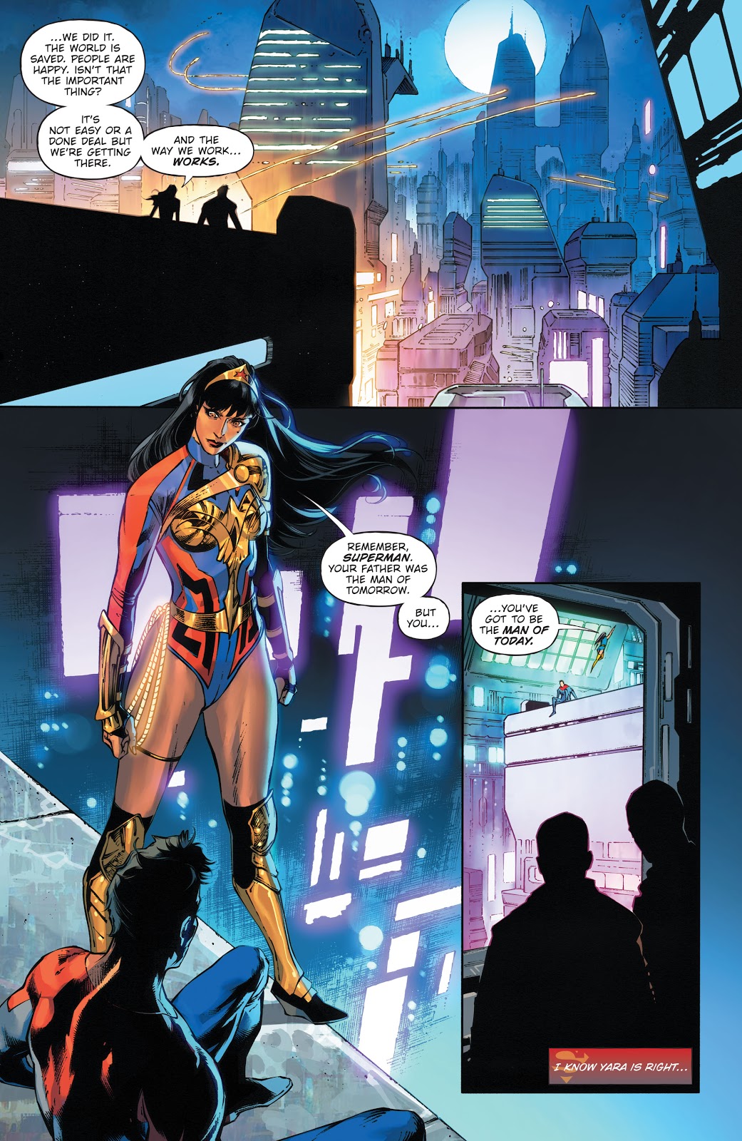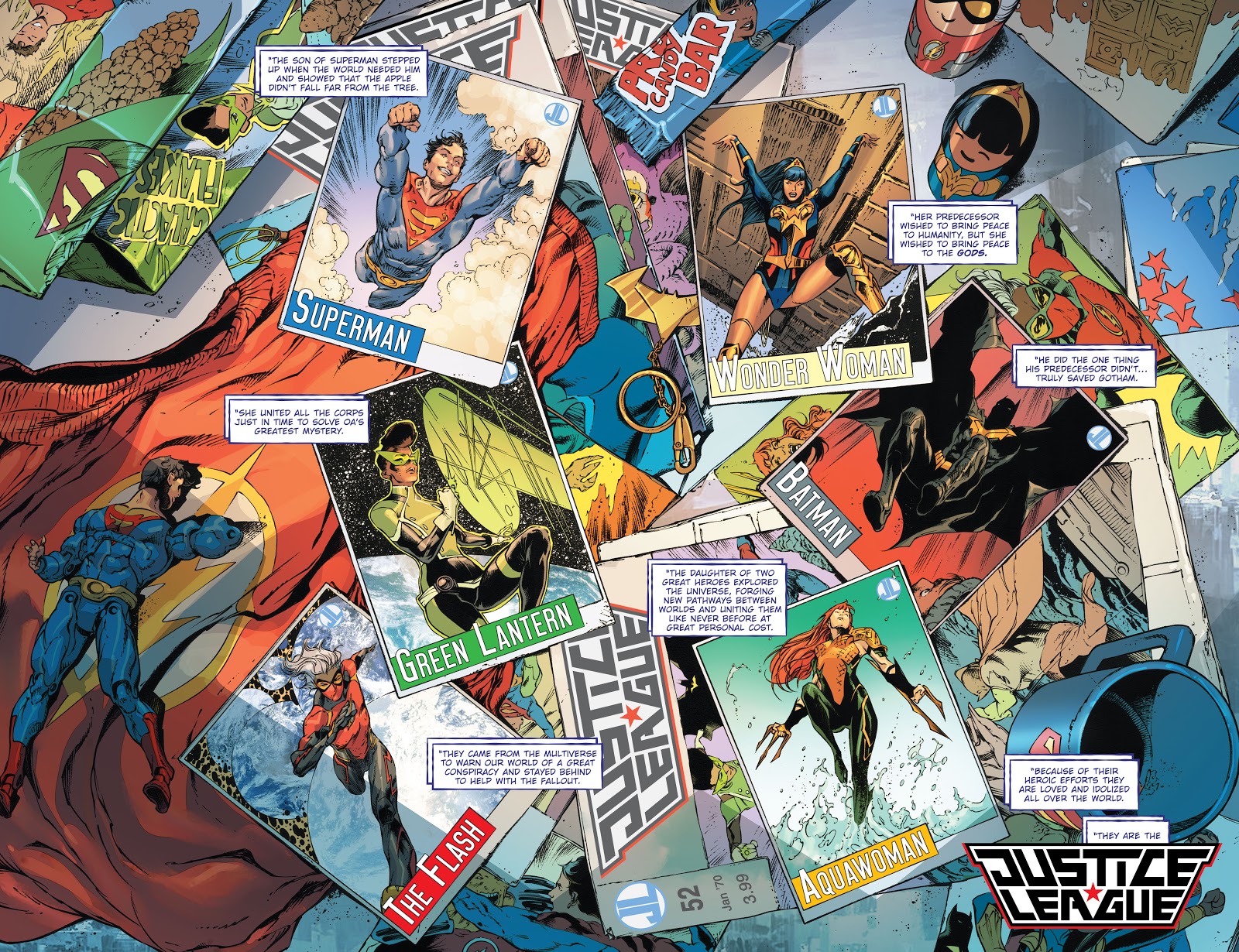 Nyní přejdeme k postavám. Ty si mě dokázaly získat už od prvních několika stran. Co se mi zamlouvá ze všeho nejvíce, jsou vzájemné interakce, které jsou funkční a nejsou patetické. Scény, kdy spolu hrdinové komunikují, navazují mezi sebou vztahy, jsou jedny z nejpamátnějších. Za pomyslný vrchol považuji důležitý moment mezi Supermanem a Wonder Woman, díky kterému mi Williamson nejen ukázal, jak kvalitně mohou být napsáni hlavní protagonisté, ale také to, že nová Wonder Woman má coby postava co nabídnout. Teď mě neberte špatně, v recenzi na “Future State: Wonder Woman” jsem psal, že i přes počáteční rozpaky a nemastný neslaný začátek si mě dokázala získat. Ovšem až v Justice League jsem si k ní dokázal utvořit větší citové pouto, což je chvályhodné. Co se týče ostatních postav, ty mě taktéž dokázaly zaujmout. Jediní dva, kteří mi moc k srdci nepřirostli, byli Green Lantern a Batman. U Batmana, po celou dobu vyprávění tajemného jako hrad v Karpatech, by to ještě nevadilo, protože se o něm více dozvím až po dočtení minisérie “Future State: The Next Batman” od Johna Ridleyho, avšak u Jo Mullein už to potíž je, vzhledem k tomu, že by se v žádné jiné minisérie objevit neměla. Právě Lanternce, ačkoliv dostane prostor na projevení svého charakteru, by slušel nějaký samostatný komiks, popřípadě kratší povídka v antologii či jiné sérii z Future Statu, protože takhle je to pro mě jen generická, ničím ohromující hrdinka, jež dříve nebo později zapadne.