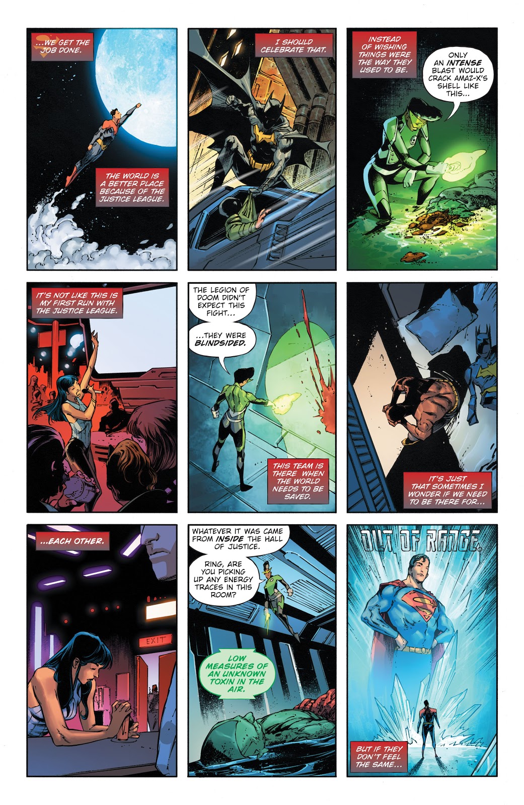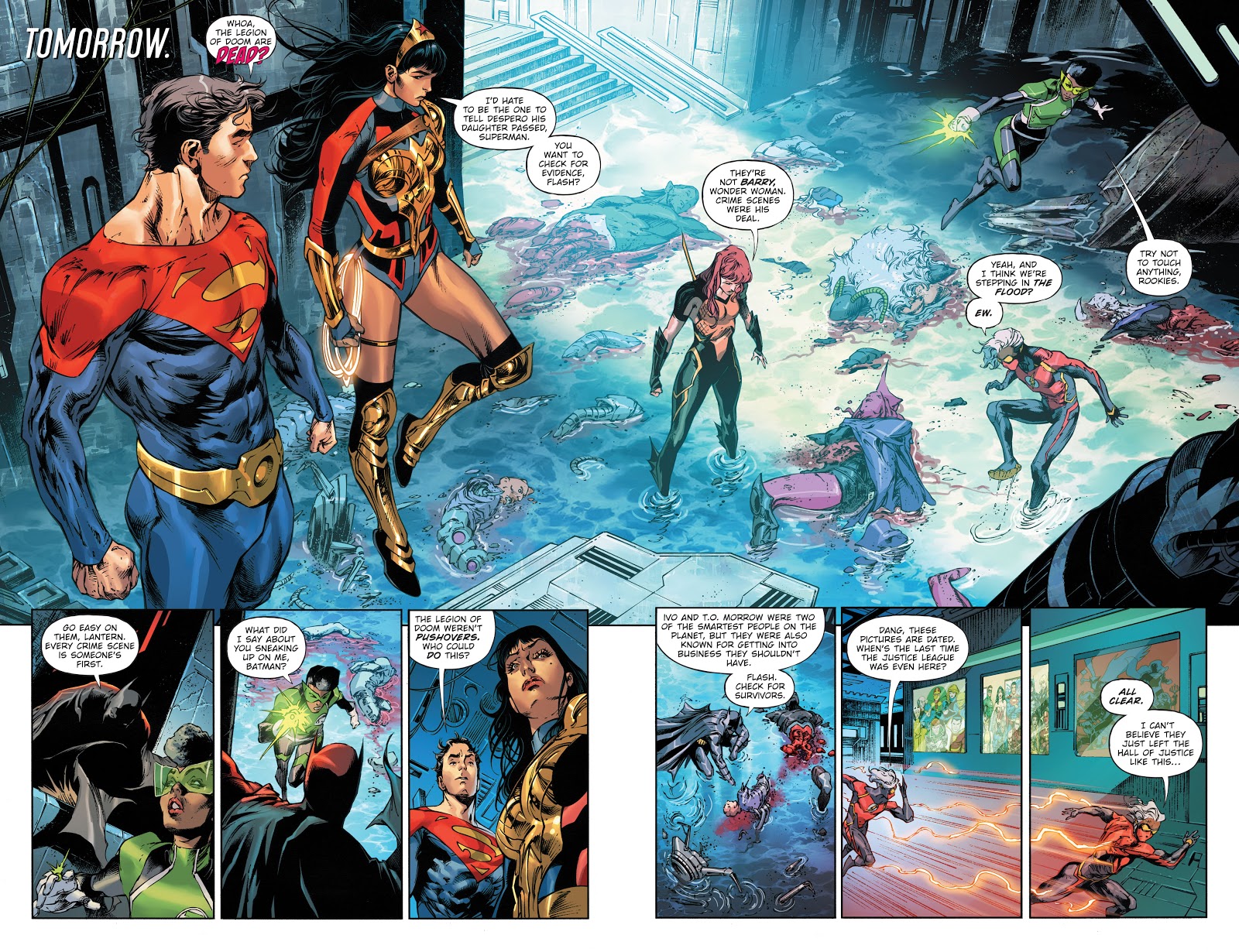 Co se týče příběhu, ten je - jak už bývá u Future Statu zvykem - zasazen do daleké budoucnosti. Ocitáme se v období, kdy starou Ligu nahradila zcela jiná. Jak se dozvíme hned v úvodu, tým ve složení Superman (Jon Kent, syn a zároveň následovník původního Supermana), Wonder Woman (Yara Flor, která titul hrdinské bojovnice přebrala po princezně Dianě), Batman (pravděpodobně černoch, jehož identita nám je utajena), Flash (mladík Jess Chambers), Aquawoman (dcera Arthura Curryho, původního Aquamana) a Green Lantern (černoška Jo Mullein) za sebou mají již nespočet bitev s mocnými vládci z jiných planet, potrhlých šílenců bez špetky slitování nebo zlosyny z různých koutů Země. Skupina se již dokázala naladit na správnou notu. Úspěšně se scelila a vztahy mezi hrdiny se veskrze ustálily. Liga se nyní musí po velkolepých konfliktech vrhnout na vyřešení vcelku komorního případu. Jejich největší protivníci, členové pověstné Legie zkázy (v originále Legion of Doom), jsou všichni do jednoho nalezeni mrtví. Byli zavražděni neznámo kým. Proto musí superhrdinská formace jednat a co nejdříve najít pachatele, který za tímto trestuhodným činem mohl stát.