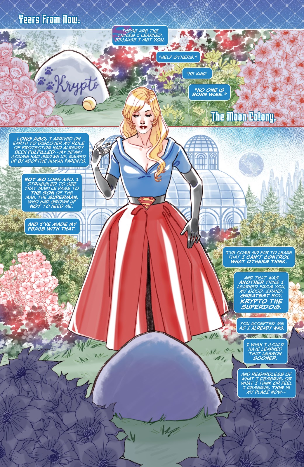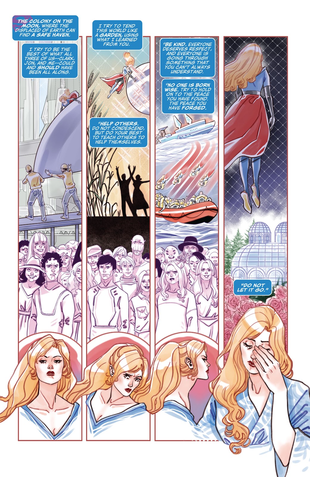 Příběh pojednává o superhrdince Kaře Zor-El, sestřenici Supermana, ze které už dávno není Supergirl, ale Superwoman, protože v daleké budoucnosti dospěla. Sledujeme ji ve chvíli, kdy jednou provždy odešla ze Země a rozhodla se usídlit na Měsíci, kde žije spokojený život. Vše se ovšem změní jednoho obyčejného dne, když na měsíční povrch dopadne vesmírné plavidlo, z něhož vzápětí vyleze tajemná modrá postava, již Superwoman nikdy předtím neviděla. Jak později zjistí, jde o uprchlíci, disponující neobyčejnými schopnostmi, která tají řadu tajemství. Když se spolu dají do řeči, začne se Kara dozvídat mnoho informací, jež jí poodhalí detaily o její minulosti, a zároveň si začne pomalu, ale jistě uvědomovat, že se blíží něco velkého. Pravděpodobně nová tajemná hrozba. Ovšem tradičního supermanovského záporáka v žádném případě nečekejte!