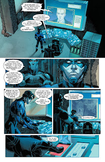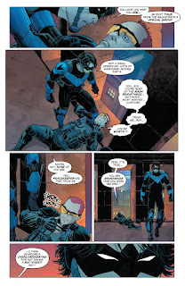 Scénárista Andrew Scott (pro mě absolutně neznámé jméno) se rozhodl vsadit na jistotu a Dicka pojal docela ošemetně. Na jednu stranu se jej snaží psát jen jako dalšího gothamského superhrdinu, jehož jediným cílem je zachraňovat civilisty a úspěšně vzdorovat silám Magistrátu. Nic standardního. Přece jenom, protagonistu s hrdinskými ideály a s jasným údělem jsme viděli již tisíckrát. Každopádně, autor si toho je plně vědom, a tak Dicka postavil do trošičku jiné role: rozhodl se z něj udělat mentora pro nového Batmana (jeho samostatnou minisérii si na Comics Blogu již brzy zhodnotíme), což je vcelku osvěžující prvek, který vynikne především v druhé polovině vyprávění. Dynamika mezi oběma postavami je využitá na maximum, přičemž některé scény z druhého čísla vás mile překvapí.