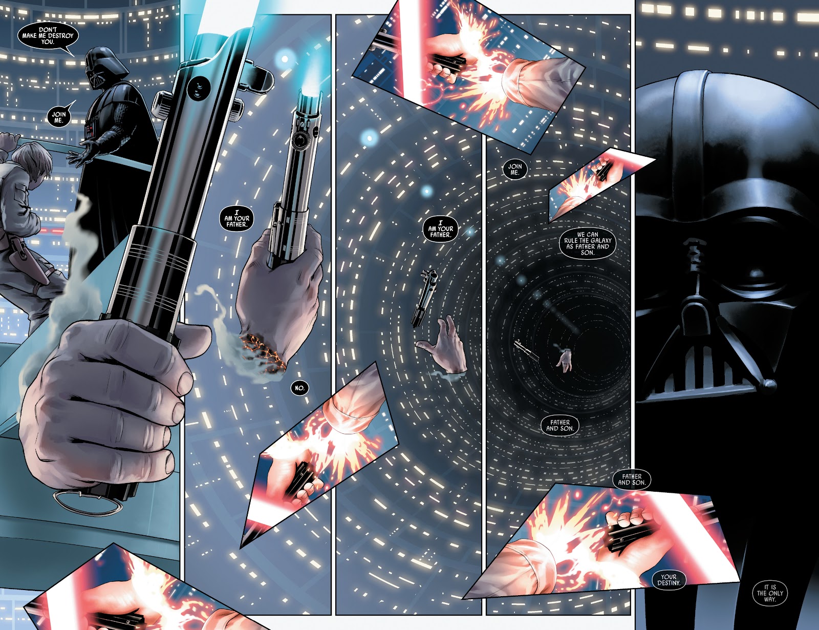 Nejprve je nutné se vyjádřit ke scénáři, k jehož struktuře nemám v zásadě žádné výhrady. Soule nešetří akcí, kterou servíruje v příměřených dávkách, a kromě pompézních, dechberoucích scén taktéž dojde řada na mnohem jednodušší, značně přízemnější akčních pasáže, v rámci kterých ústřední hrdinové bojují proti Stormtrooperům. Samozřejmě, nezapomíná ani na klidnější části, během nichž může rozvinout charaktery jednotlivých postav. Obzvlášť propracovaný mi přišel Luke Skywalker, na němž si dal Soule opravdu záležet. Vzhledem k tomu, jaké trauma prožívá, se snaží zaměřit především na jeho nitro, a především na nejistotu, kdy si člověk není sám sebou jistý a netuší, co sám od sebe má očekávat. Celá Lukova linka je naprosto brilantní, což je možná také důvod, proč jsou poslední dva sešity, jež jsou zaměřené pouze na jedno nelehké Lukovo dobrodružství, asi jedním z nejpamátnějších momentů celé knihy. Smekám kloubouk dolů!