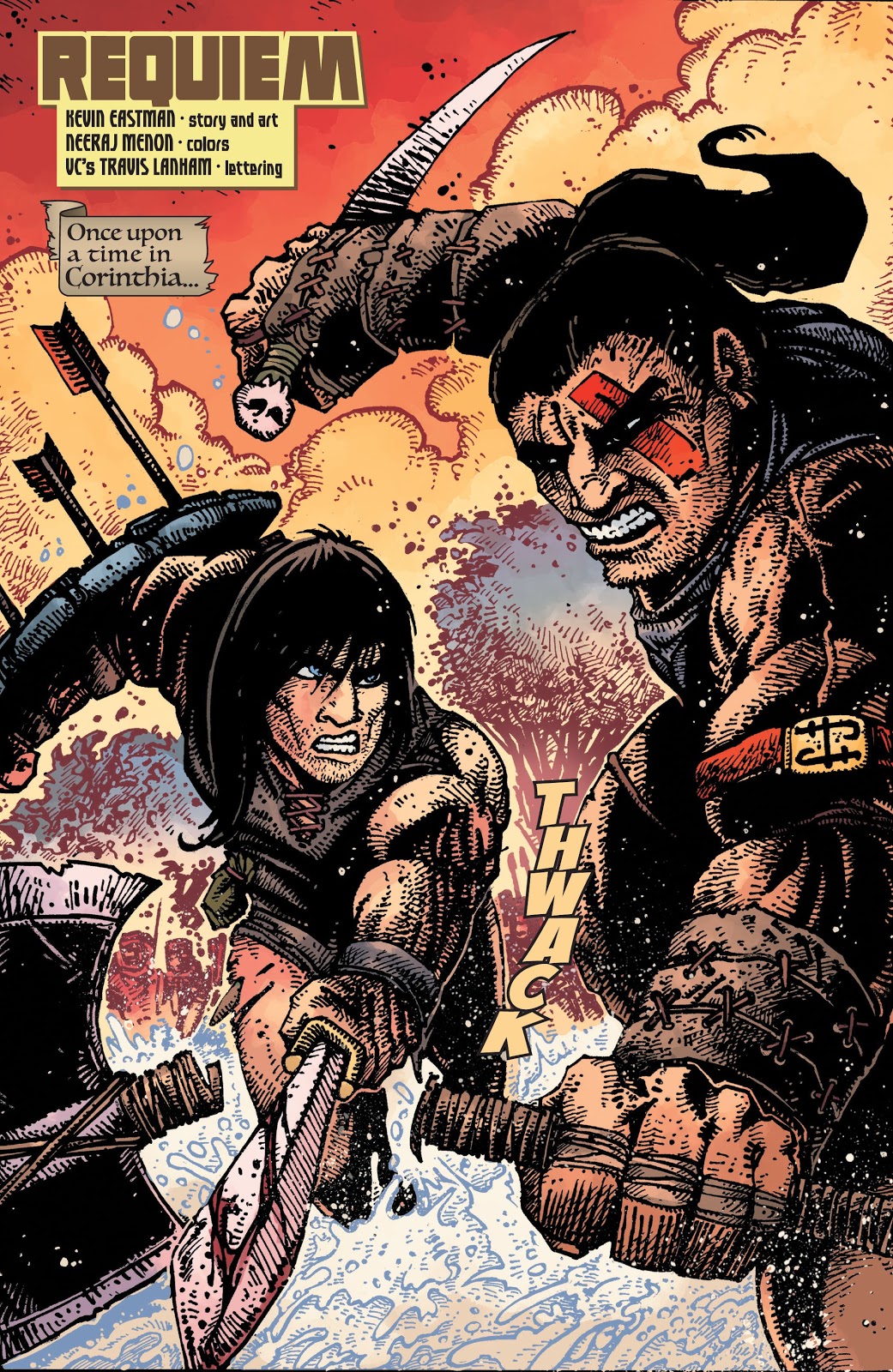 Asi největší experiment, jaký v sešitu “King-Size Conan” najdete. Scénáře i kresby se chopil Kevin Eastman, spoluautor původních komiksů s Želvami nindža a drsného, nekompromisního uzavřeného příběhu Počítání mrtvých (v originále Body Count), který čtenářům naservíroval čistokrevný akčňák s názvem “The Requiem”.