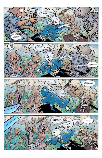 Prvně musím hodně pochválit Sakaie za jeho práci s tempem. Ví, kdy má zpomalit, kdy je naopak potřeba zrychlit, a mimoto rozumí tomu, jak má správně používat dialogy. Když to není nutné, nemá zapotřebí je využívat při akčních sekvencích, kde jsou spíše přebytečné, a naopak se je snaží co nejvíce využít při poklidnějších pasážích, kdy je potřeba rozvíjet personality jednotlivých hrdinů, ať už jde o Usagiho, celou želví partu nebo senseie Kakeru. Ovšem nesmím také opomenout, že záporné postavy, které se v příběhu objeví, jsou nápadité a mají co nabídnout v rámci děje. Když k tomu připočtu hravé designy, jež jsou doplněny o velmi pěkný coloring, dostaneme po stránce kresby opravdu pěkný zážitek. A ano, barvy mi vážně nevadily. Naopak mi přišlo, že místy hezky doplňovaly některé pasáže a scenérie.