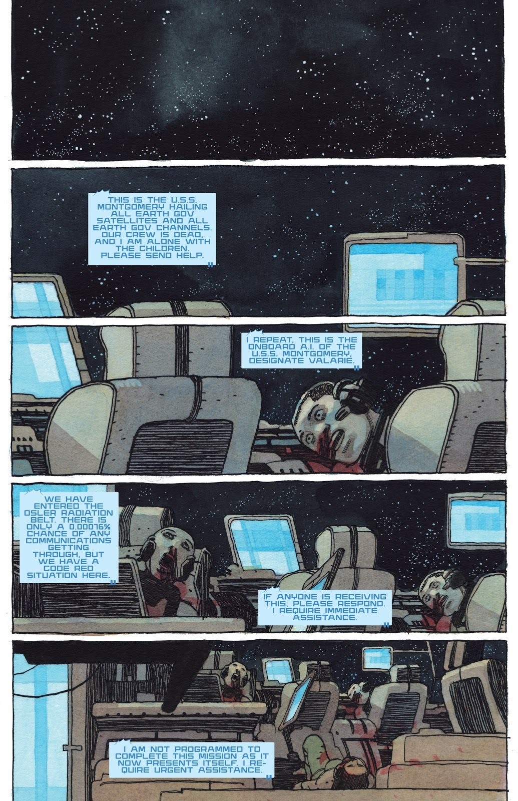Jde o grafický román, spadající do žánru sci-fi, ve kterém sledujeme posádku vesmírné koloniální lodi. Tu má pod dohledem umělá inteligence jménem Valerie, přičemž její součástí jsou nejenom dospělí, ale také úplně obyčejné děti. V rodinném scénáři bychom sledovali idylický příběh ve vesmíru o dospívání, získávání potřebných zkušeností a o tom, aby každý z nás byl sám sebou, ovšem toto je Lemire, který namísto toho nechá zabít všechny dospělé na palubě, protože prostě nemohou přežít všichni. Přežijí pouze děti, které jsou z celé situace rozhozené a traumatizované. Neví, co je čeká, ani co se s nimi bude dít dál. Valerie tak je v nelehké roli a musí se proto nejenom postarat o zbytek posádky, ale také je nucena ukočírovat vedení lodi jako takové.
