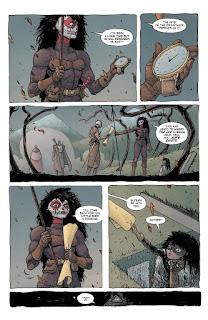 Co se týče kresby, o té bych se mohl obsáhle rozepsat, ale pro účely recenze to raději trochu zkrátím. Ian Bertham má vskutku osobitý styl, který se jen tak nevidí a který na vás dýchá už od několika prvních stránek. To se projevuje hlavně na postavách, jež vypadají specificky, doslova unikátně. Všimnout si toho můžeme hlavně na očích. Ty jsou totiž výrazné, dovolil bych si říct i trochu karikaturní, ale kromě toho to jde poznat i na designech jednotlivých postav. S tím se pojí skvělý coloring, jenž je postavený hlavně na bledých a méně výrazných odstínech všech možných barev, a také panelování, jež i přes občasnou chaotičnost a přehnanou zmatečnost povyšuje čtenářský zážitek o stupeň výš. Zejména v akčních pasážích fungují oba dva prvky na výbornou, ovšem i v pomalejších částech pomáhají naprosto dokonale vykreslit atmosféru pustého světa.