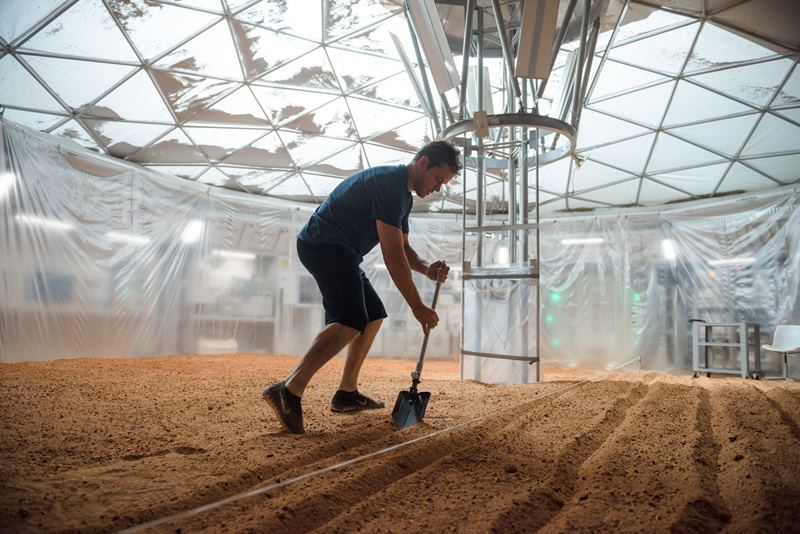 Že je Mark naživu, se v NASA každopádně dozví ještě předtím, než k onomu kontaktu dojde (satelity zachytí pohyb nějakého vozítka), a naplánují, jak k němu dostat zásoby, jež by mu vydržely dostatečně dlouho, než se k němu vypraví záchranná mise. Jídlo by ale do té doby Markovi na Marsu stejně nevystačilo, takže si tam začne v extrémních podmínkách improvizovaně vyrábět vodu a pěstovat brambory.