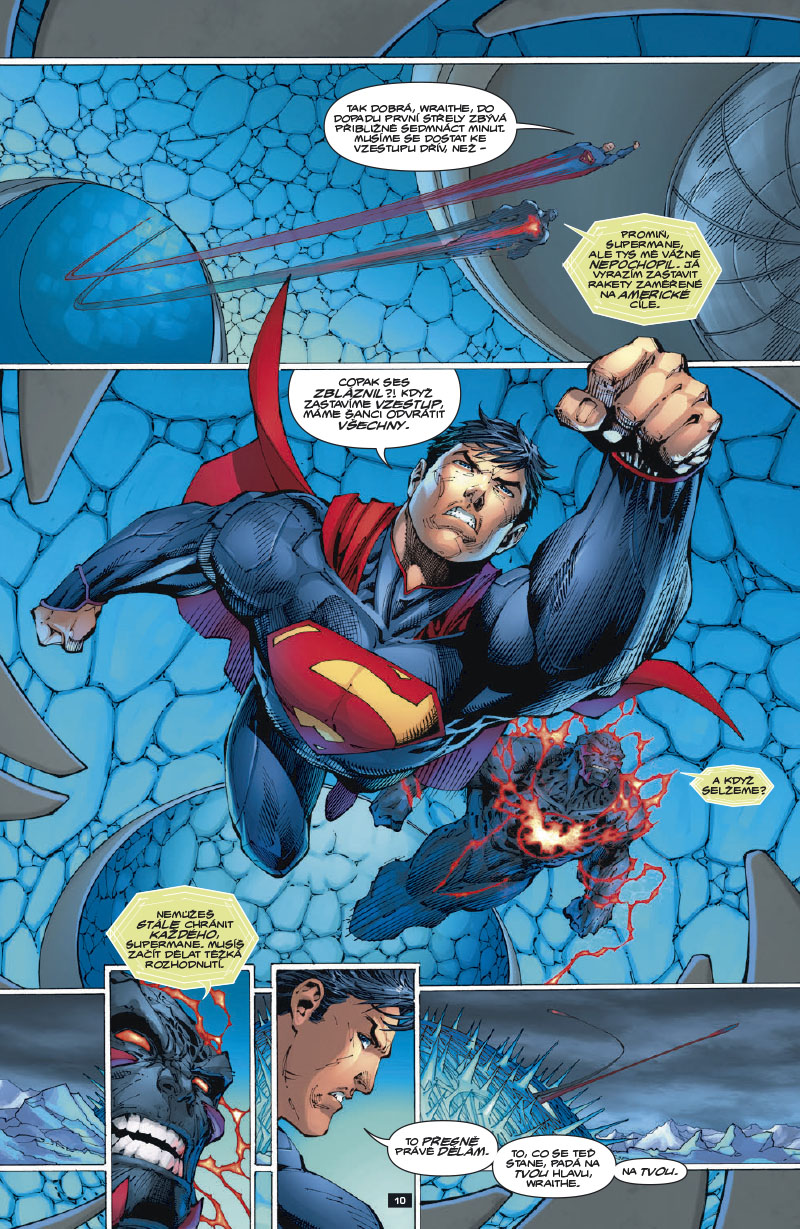 Co nudné není, to je Leeho kresba. Strana 50 mi doslova vyrazila dech a některé další velké panely jsou prostě nádherné. Jako kdyby Lee pod Snyderovým scénářem nabral dech a zase jednou se snažil a skutečně kreslil nádherné obrazy. Bohužel to nic nezmění na tom, že postava Supermana zůstává stejně problematickou jako vždy. Tenhle komiks křičel po jiném konci, křičel po tom, aby se Supermanův svět změnil, aby došlo k zásadnímu zlomu v jeho životě, a to spíše negativním směrem, ale nic takového nás samozřejmě nečeká. Musíme se spokojit s tím, že je tohle uzavřená minisérie, kde Jim Lee ukázal, že je pořád jedinečným mainstreamovým autorem a že ho v kresbě jen málokdo překoná. Alespoň v rámci superhrdinského komiksu.