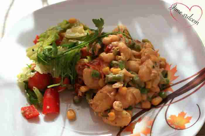 Na olivovém oleji orestujeme nakrájenou cibuli a česnek, přidáme nakrájené žampiony a pět minut restujeme. Přidáme hrášek, kukuřici, fazolky a dalších pět minut smažíme na pánvi.